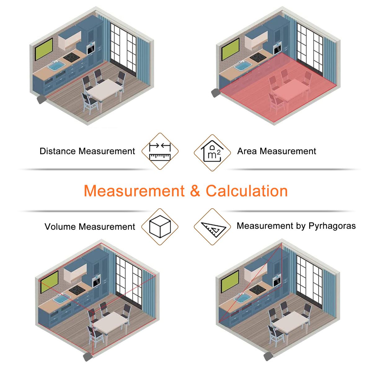 Multiple Functions: This tape measure provides multiple measuring modes for length measurement, continuous measurement, area, volume and Pythagoras measurement.