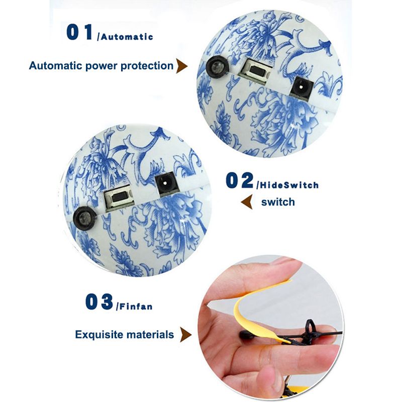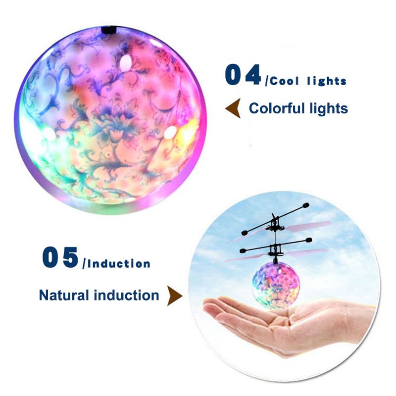 1.INFRARED INDUCTION FLYING: When you turn on the switch, it will automatically begin to fly in 2 or 3 seconds. It takes off and goes as it pleases, hovering around until it detects a solid object, then it turns and goes . You can put your hand under the flying ball when it falls at some height,then it will go up again. It is such a cool and fun toy!