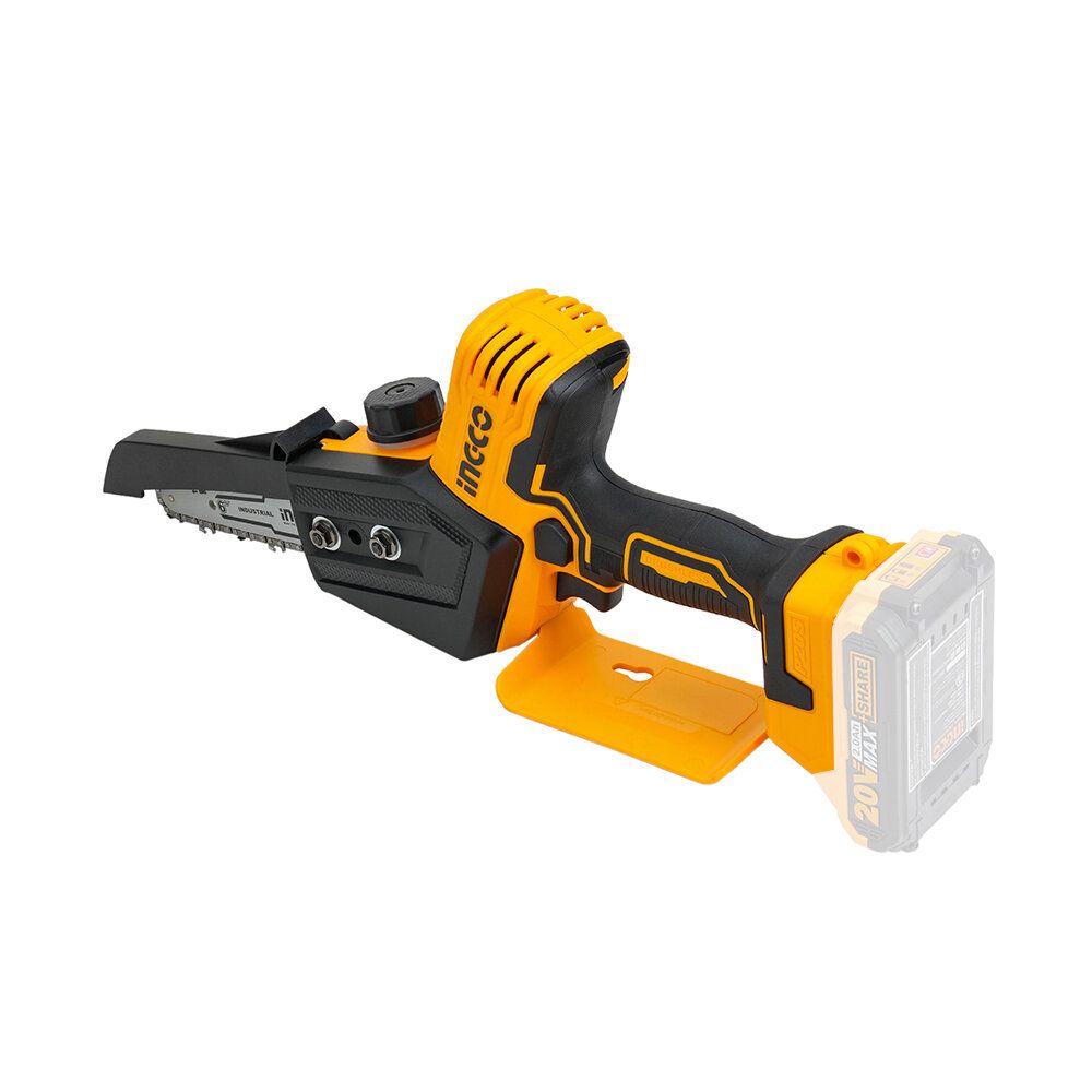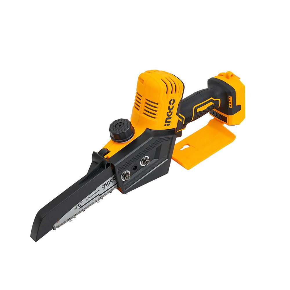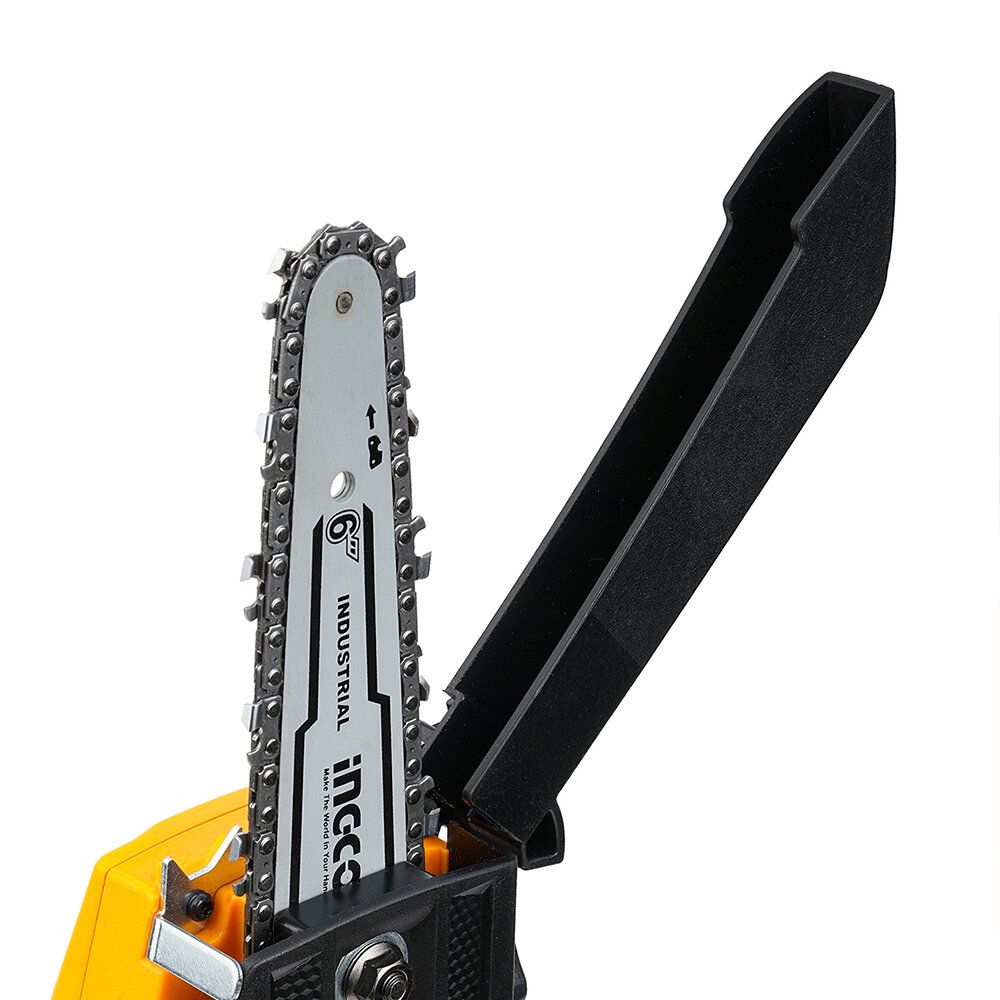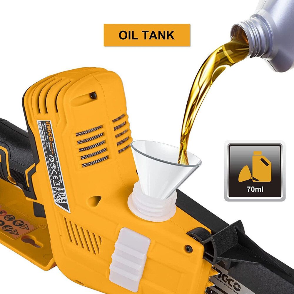The cordless mini chain saw, equipped with a 6 inch guide plate, brings great convenience for work. The installed chain is mdae of steel and its speed is 11 m/s. The comfortable grip is non-slip and ergonomic, which makes you work more effciently. The max capacity of the oil tank is 70 ml, which delivers a steady oil supply and ensures a saw running for years.