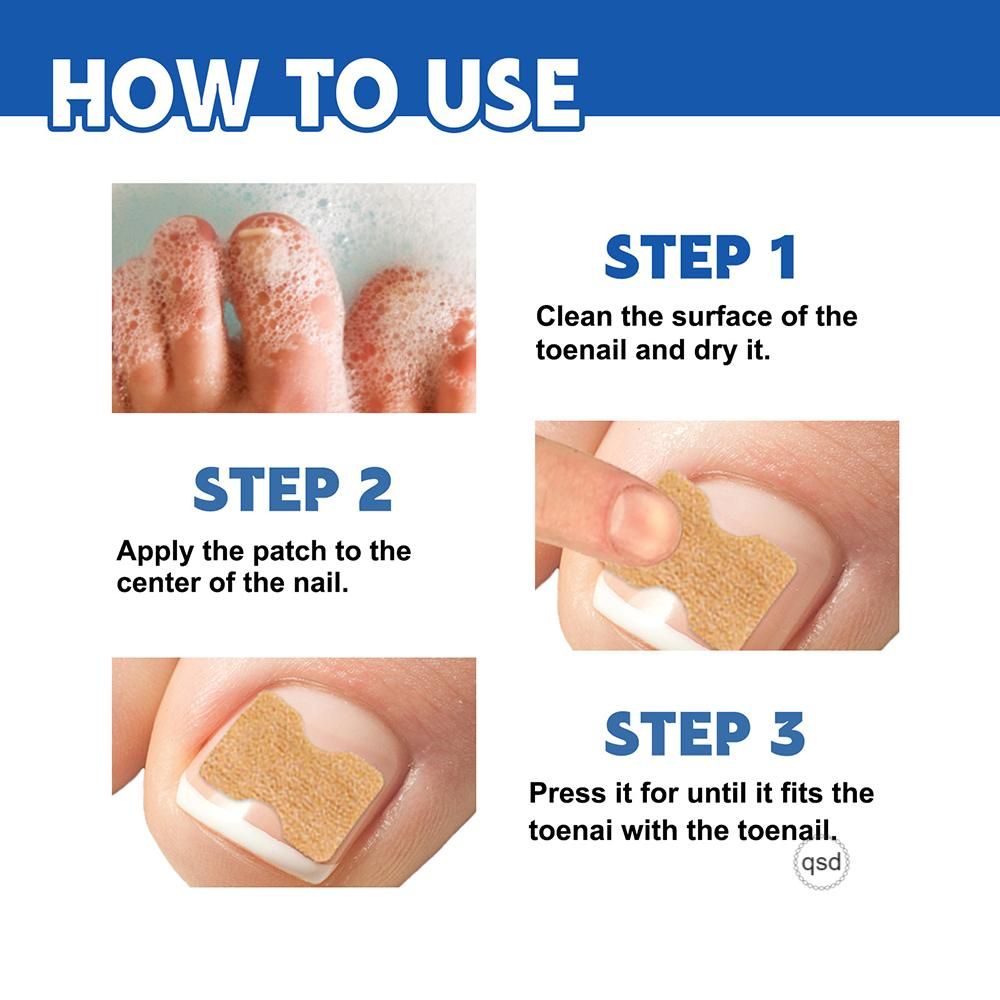 How to apply: 1. Clean and dry the toenail face. 2. Press the toenail patch in the center of the toenail. 3. Press for moments until it fits the toenail completely.