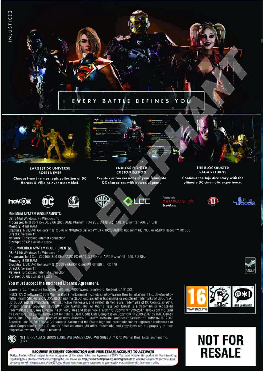 <br />Injustice 2 game detailsYou can now control and create your favorite DC legends in INJUSTICE 2. Now there is a huge selection of DC Super Heroes and Super-Villains. INJUSTICE 2 enables every iconic character with different and jaw-dropping gear earned in the game. You decide how your favorite characters look, fight, and develop throughout all of the game modes. Now you manage all with Your Super Hero.<br />Here are the Injustice 2 System Requirements (Minimum)CPU Intel Core i5-750, 2.66 GHz / AMD Phenom II X4 965, 3.4 GHz or AMD Ryzen™ 3 1200, 3.1 GHzCPU SPEED InfoRAM 8 GBOS 64-bit Windows 7 / Windows 10VIDEO CARD NVIDIA® GeForce™ GTX 570 or NVIDIA® GeForce™ GTX 1050/ AMD® Radeon™ HD 7850 or AMD® Radeon™ RX 550PIXEL SHADER 5.0VERTEX SHADER 5.0DEDICATED VIDEO RAM 1024 MBInjustice 2 Recommended RequirementsCPU Intel Core i3-2100, 3.10 GHz / AMD FX-6300, 3.5 GHz or AMD Ryzen™ 5 1400, 3.2 GHzCPU SPEED InfoRAM 8 GBOS 64-bit Windows 7 / Windows 10VIDEO CARD NVIDIA® GeForce™ GTX 780 / AMD® Radeon™ R9 290 or RX 570PIXEL SHADER 5.0VERTEX SHADER 5.0DEDICATED VIDEO RAM 3072 MB |
