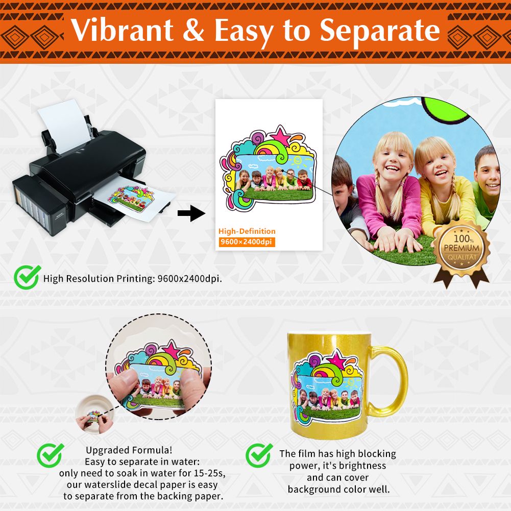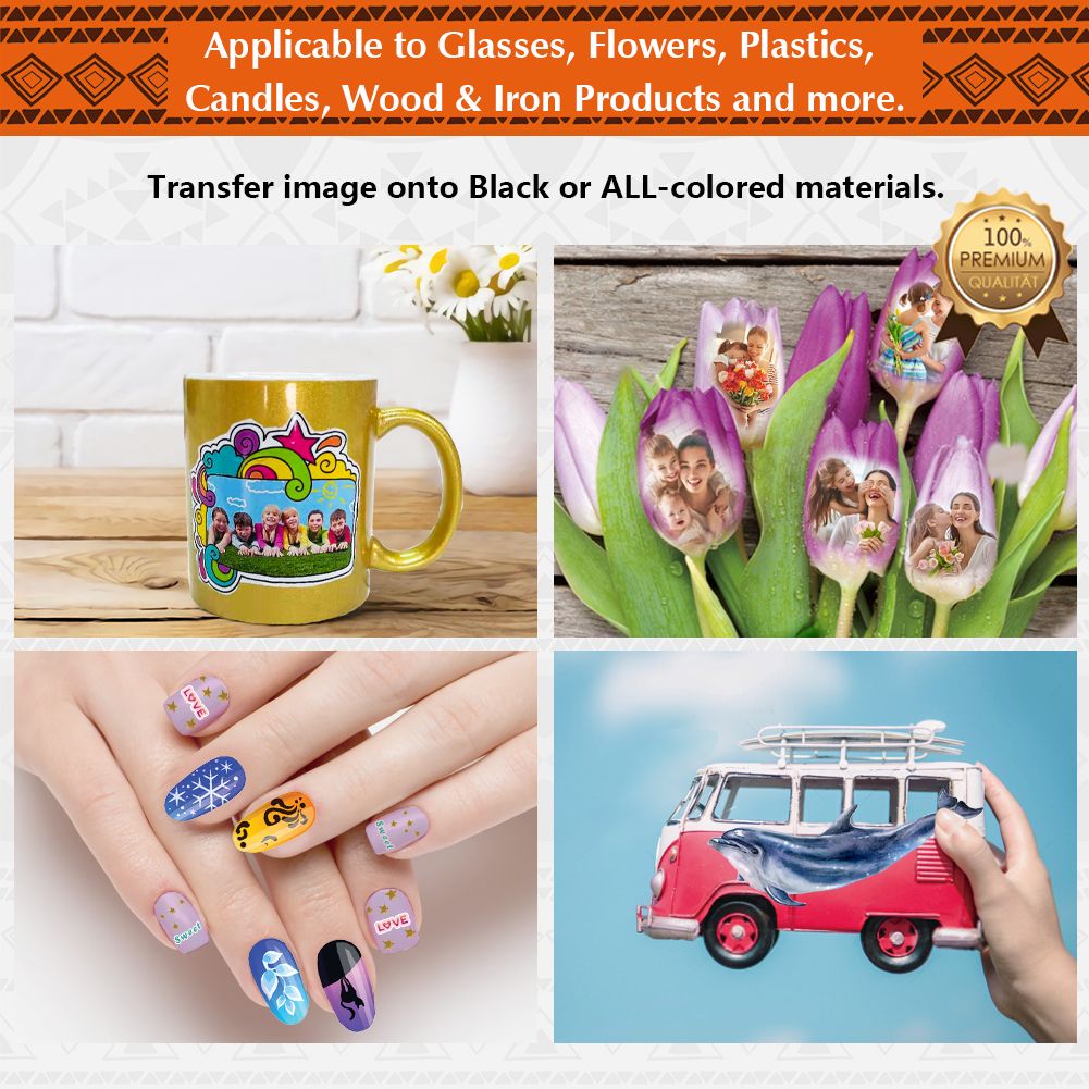 HIGHT QUALITY: The decal paper is composed of 2 layers. Bottom layer is custom 120g-backing paper, great for continuous printing without paper jam. Top layer is the transfer membrane - 10% thicker and more elastic than others. It is not easy to break but easy to fit. It can be used on some objects with curved surface.
