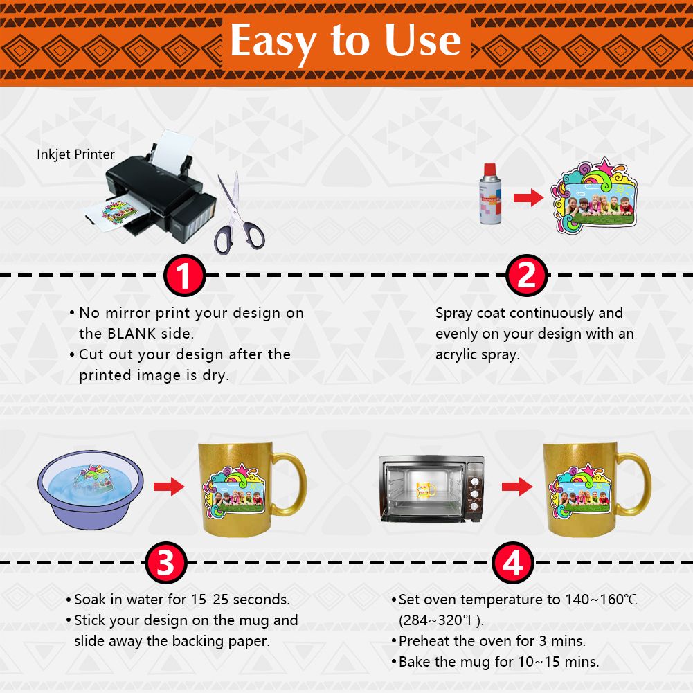 EASY TO USE: [1] Print your design. [2] Spray coating twice. [3] Cut out your design. [4] Soak in water. [5] Transfer onto ceramics or glasses. [6] Bake in oven.