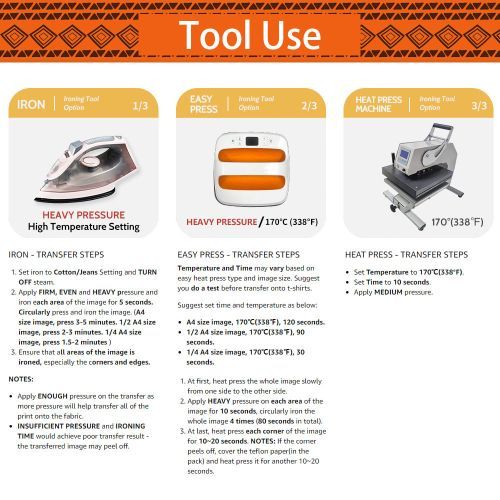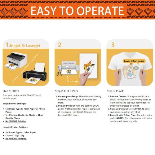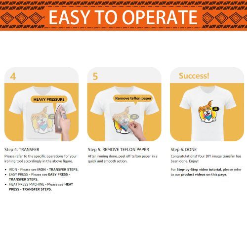 EASY TO USE: [1] Print & Cut out the image. [2] Peel & Place the printed image facing UPWARD onto fabric and cover the image with Teflon Paper. [3] Transfer Image with Iron or Heat Press. [4] Remove the teflon paper. Transfer has been done! Step-by-step instructions are on the back of cover paper in the pack.
