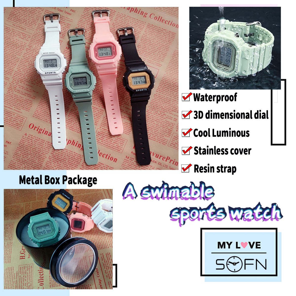 - Function: adjustable strap, electronic watch, luminous, alarm clock, time, date, chronograph