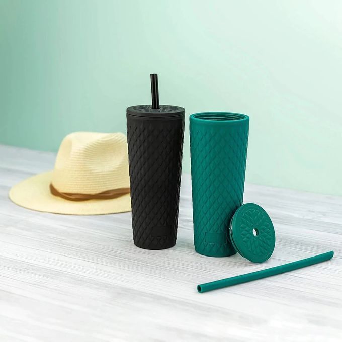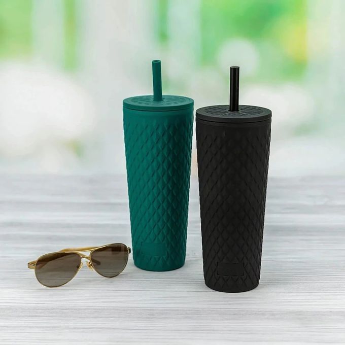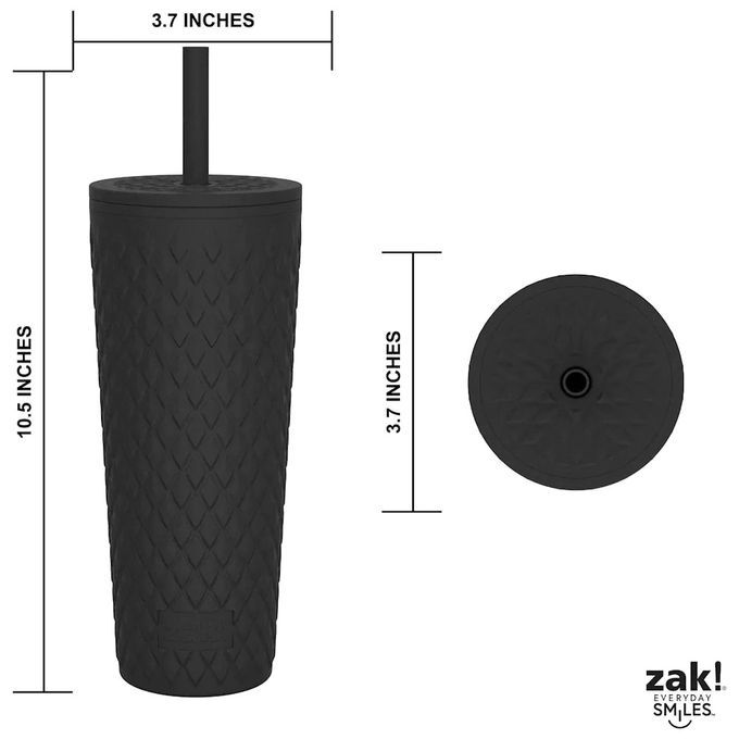Hydrate in style with these insulated tumblers!The set includes two different colored cups with matching lids and straws. The textured, soft-touch outer walls and silicone straws are perfect for drinking in comfort.A capacity of 0.7Litre means you can drink plenty of water before needing a refill, and the tumbler still fits in car cup holders so you can hydrate on the go.Made of plastic, the drinking tumblers are durable enough to use every day as well as BPA-free and can be easily cleaned in the top rack of the dishwasher.These stylish tumblers eliminate messy water rings and slippery condensation with thick double-wall insulation. This Set includes 2 tumblers with lids and straws. The textured, soft-touch outer walls and silicone straws are perfect for drinking in comfort. A capacity of 24 ounces means you can drink plenty of water before needing a refill, and the tumbler still fits in car cup holders so you can hydrate on the go. Brand: Zak Material: PlasticColour: Black & Forest GreenCapacity 0.7litresItem weight 1kgNumber of items 1 size: H-10.5intop cover size: 3.7in
