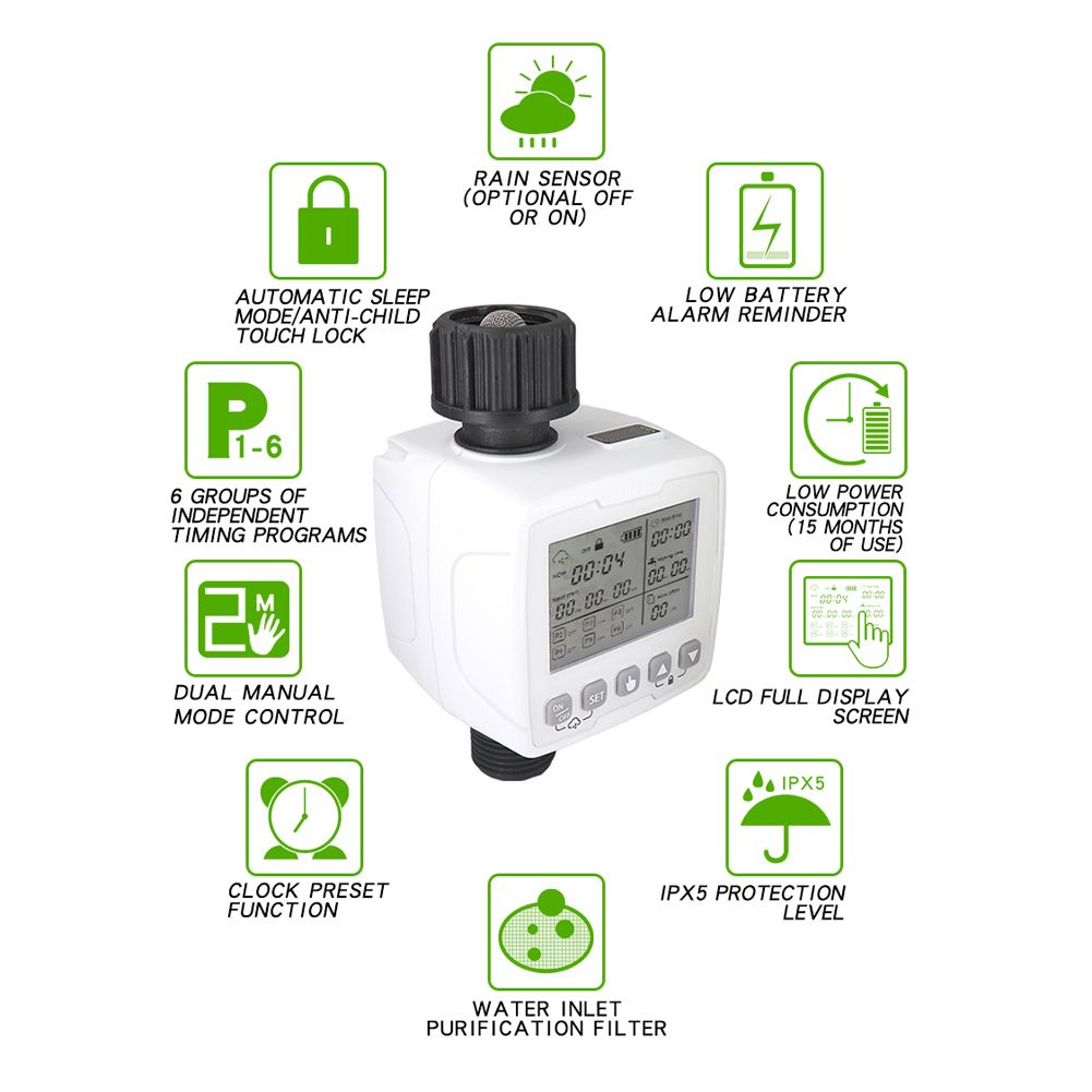 Rain Sensors Function: Rain sensors help avert overwatering. With this function, when the rain sensors detects water on the surface, the watering action will not be performed.