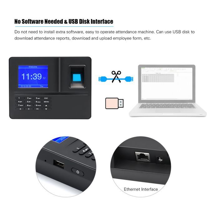 USB Disk & Ethernet Interface- Can use USB disk to download attendance reports, download/upload employee form. The product comes with Ethernet function, easy to operate and manage.