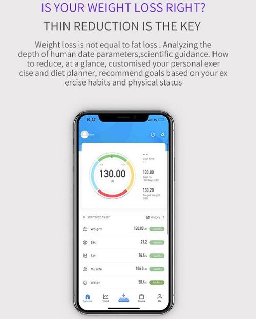 1.Shows 79 kinds of data about your body, including weight, BMI, water, visceral fat, muscle, bone mass, protein, calories, and so on. body composition analysis, analyze your body in all aspects, keeping you and your family healthy.2. Material of good quality, Adopts tempered glass, more safe and not easy to be broken. Large LCD display with cool-blue LED backlight, easy to read.3.Intelligent automatical on-off design is more energy-saving. The scale would turn on immediately when you step on it, and turn off when no body is on it.4. Connect to phone's Bluetooth APP, which has a novel function. Accurately measure the body fat rate, muscle rate, visceral fat, water content, basal metabolism and bone mass of the human body.