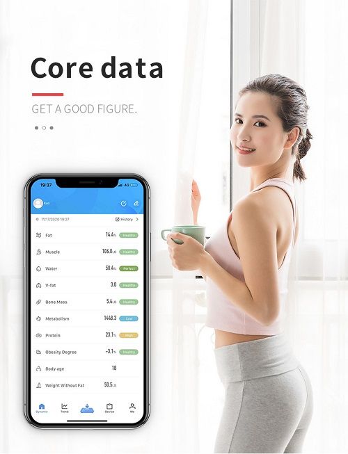 Shows 79 kinds of data about your body, including weight, BMI, water, visceral fat, muscle, bone mass, protein, calories, and so on. body composition analysis, analyze your body in all aspects, keeping you and your family healthy.