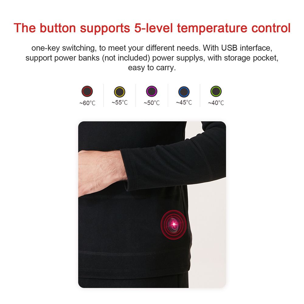 Features:8-zone intelligent heating thermal underwear is designed with heating zones for the shoulders, waist, back, elbows, knees, etc. that are prone to cold, to generate heat in a large area and promote bloods circulation.