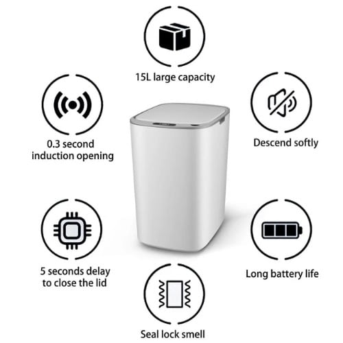 Two modes of smart panel & rarr; induction mode & rarr; Manualmode & bull; Infrared sensing technology, responsive & bull; Closed design, lock in peculiar smell and keep the room clean & bull; 3~30 cm sensing height & bull; Long battery life, turn on and off super silent & bull; Operation mode Long press the switch and the red light flashes twice as "power on" & bull; Long press the switch and the red light flashes three times as "shutdown" Specification: & bull; Commodity name: Smart trash can & bull; Main material: SS grade ABS material & bull; Power supply mode: battery type (two AA batteries) (not include) & bull; Product weight: about 0.8 kg Product size: 22x20 & times;34 cm, 15L & bull; Packing Dimension:34x29x22cmWhat Include: & bull; 1 x Smart Sensor Dustbin 15L