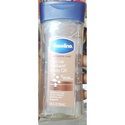 Vaseline Total Moisture Cocoa Radiant vitalizing body gel oil leaves your skin feeling healthy and glowing. Our rich feel formula with pure cocoa butter, used after bathing, replenishes skin and locks in moisture for naturally glowing skin.Keeping skin amazing.Body OilUnileverActive Ingredients:Mineral Oil; Hydrogenated Styrene/Butadiene Copolymer; Bertholletia Excelsa Seed Oil (Brazil Nut); Prunus Amygdalus Dulcis Oil (Sweet Almond); FragranceUses:When skin is healthy and hydrated, light reflects off the rich color below the surface, giving it an amazing natural glow. But daily showers strip natural, protecting oils from skin allowing essential moisture to evaporate. Used after bathing, replenishes skin and locks in moisture for naturally radiant skin. Brazilian nut oil - rich in essential nutrients known to boost skin's moisture barrier. Almond oil - naturally high in minerals and known antioxidants.