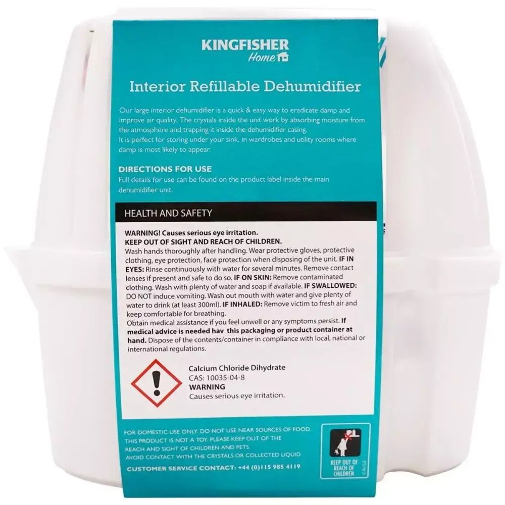Kingfisher Home Interior Dehumidifier is the quick and easy way to help remove damp and improve air quality. The special crystals inside draw moisture and damp from the surrounding atmosphere, trapping it inside the dehumidifier. It is especially useful to dry out small places with little air movement, reducing condensation and preventing mould and mildew building up.