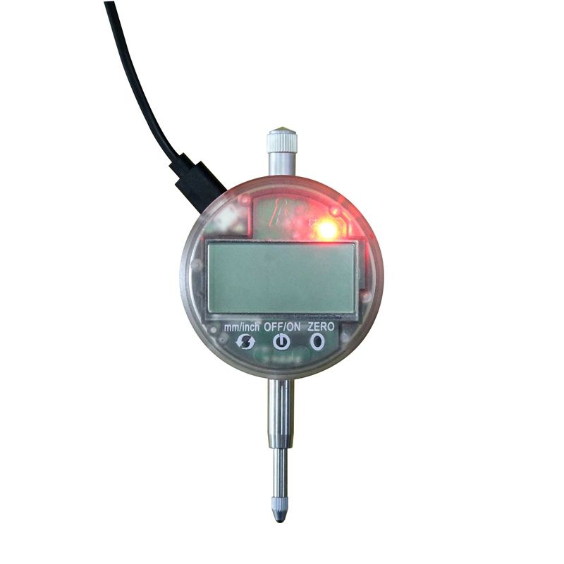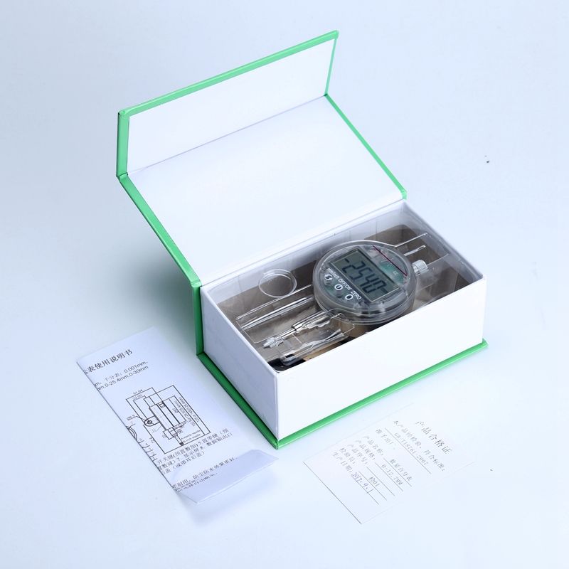 It is an inch and metric digital indicator with LCD for measuring surface variations that has measurement range of 12.7mm and a resolution 0.001mm, a lug back, a M2.5 stem diameter. Specification: Accuracy: 0.001mm; Range: 0~12.7mm; Measuring force: