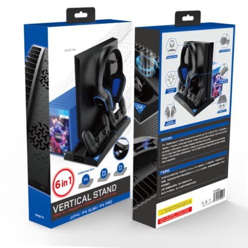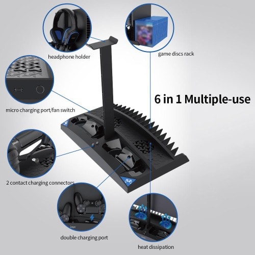 As a 6 in 1 multifunctional stand,this product can easily store PS4PS4 SlimPS4 Pro host+2As a 6 in 1 multifunctional stand,this product can easily store PS4PS4 SlimPS4 Pro host+2 controllers+headset+17 game cards simultaneously,saving a lot of space.Builtin dual cooling fans dissipate heat effectively,protecting the console from overheating. Dual port charging docks offer fast charging and realtime charging status with LEDindicators controllers+headset+17 game cards simultaneously,saving a lot of space.Builtin dual cooling fans dissipate heat effectively,protecting the console from overheating. Dual port charging docks offer fast charging and realtime charging status with LEDindicators.