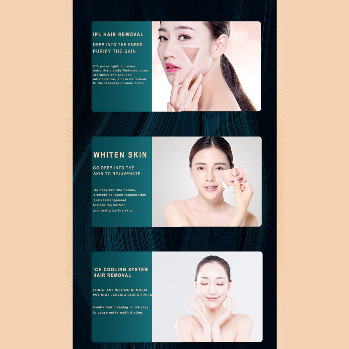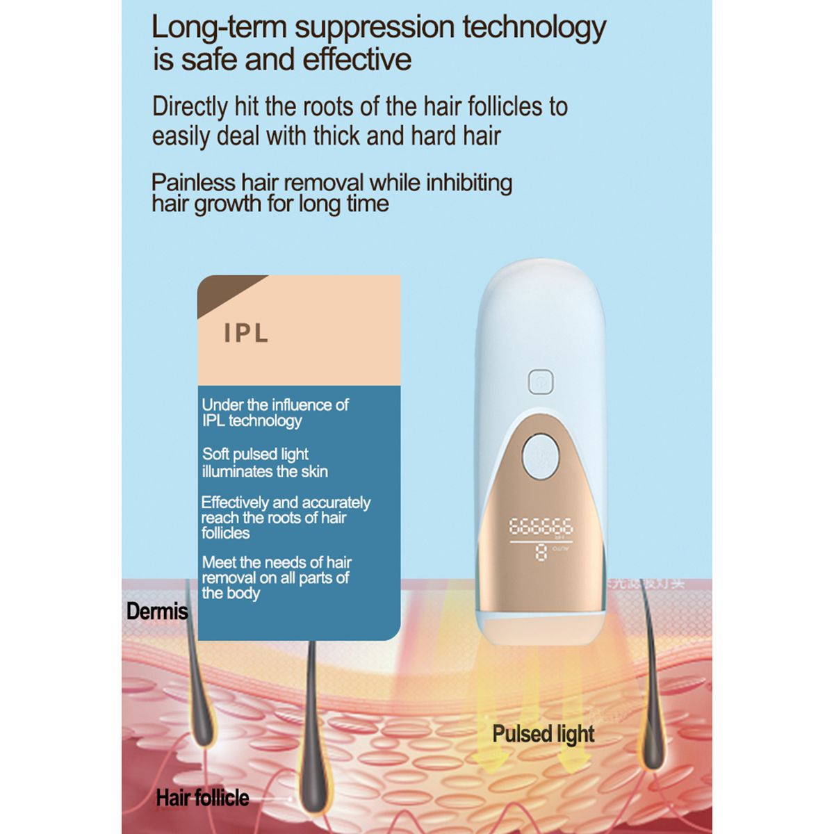 Features:990000 flashes design. It use exclusive pulsed light IPL technology: quick, painless and gain almost permanent hair removal effcect.