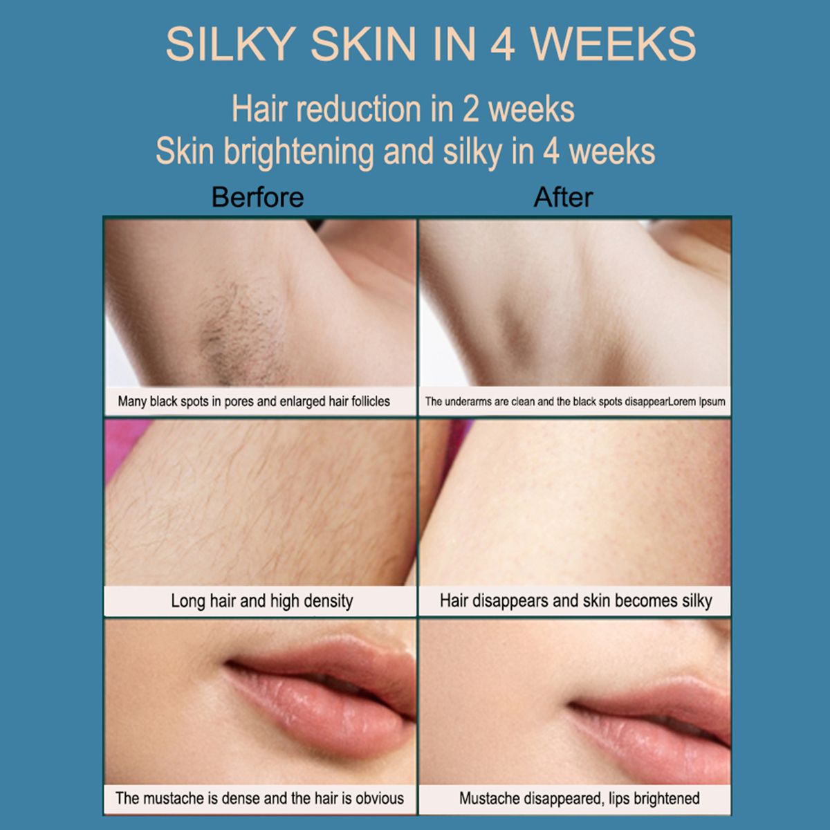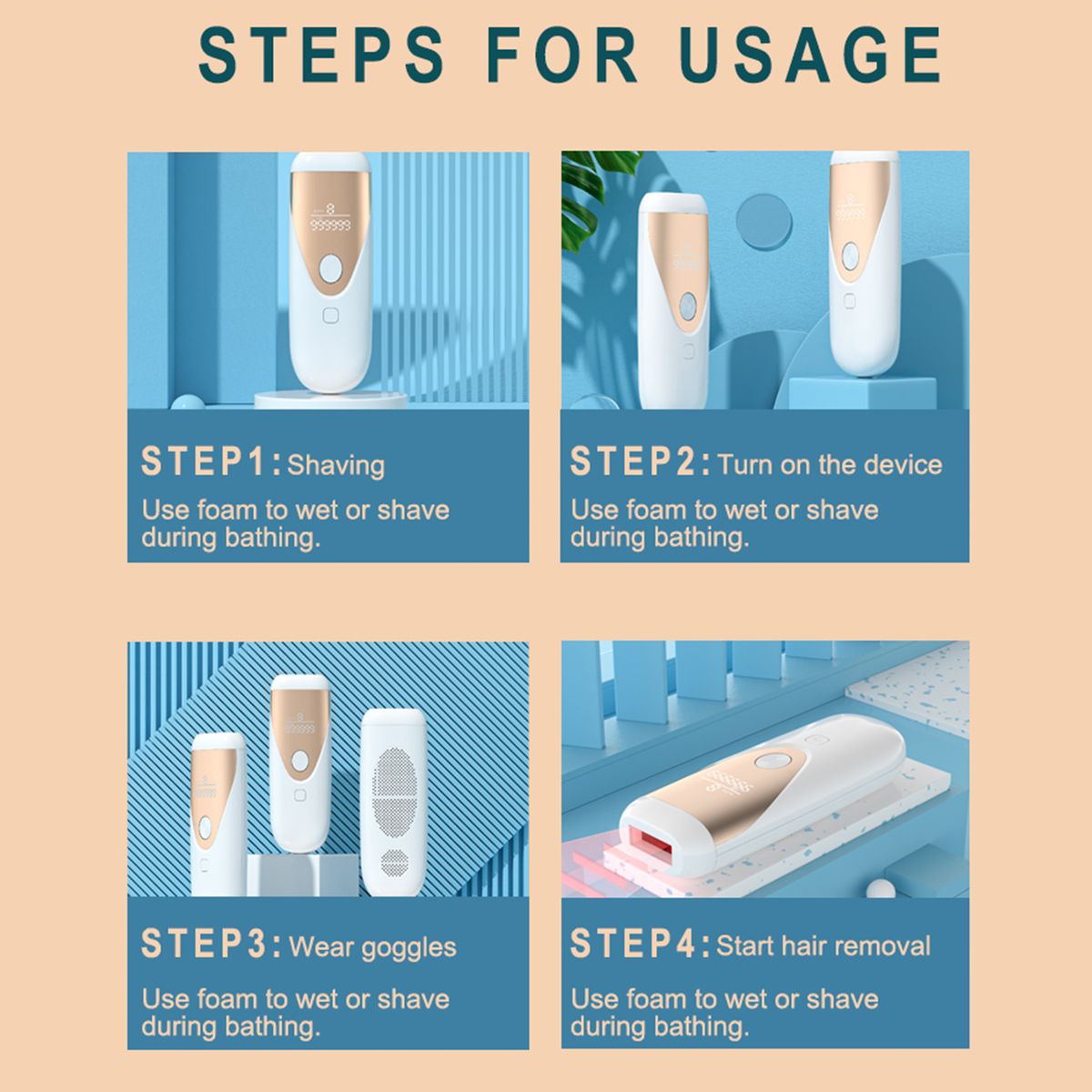 Note: 1. Be sure to shave your hair before using it and keep your skin dry and clean.