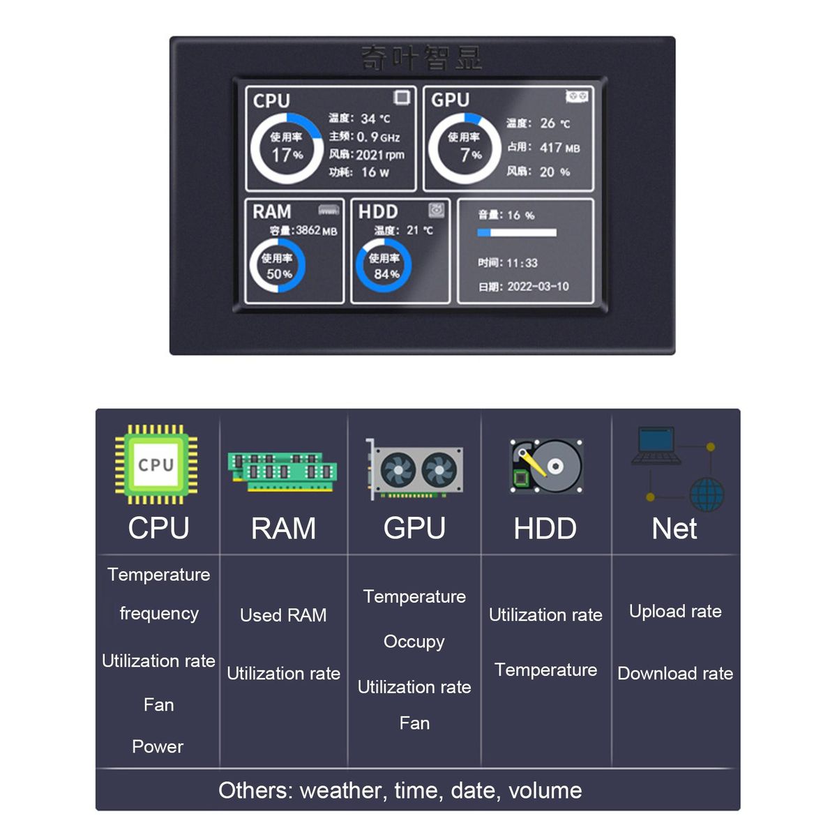 Secondary IPS Display;Secondary IPS Display Type C Secondary Screen;CPU GPU RAM HDD Monitor for Computer ;Temperature Display Monitoring Mini Dynamic;Display USB Secondary Screen Adjustable;Brightness Compact Chassis PC Computer Case