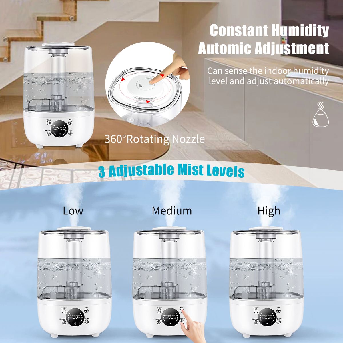 【Constant Humidity Mode】You can set the humidity from 45-90%. Detecting the surrounding humidity in real time and will automatically turn on or off to maintain the desired humidity level.