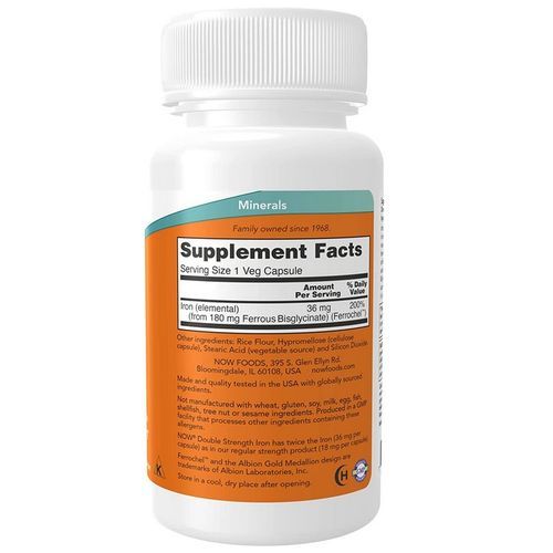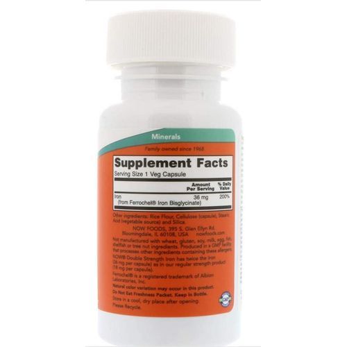 NOW® Double Strength Iron has twice the Iron (36 mg per capsule) as in our regular strength product (18 mg per capsule).