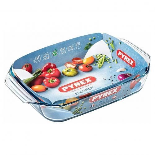 Pyrex Irresistible Glass rectangular Roaster High resistance Easy grip 35x23 cm Guaranteed for 10 years and made from Pyrex's iconic borosilicate glass which has been trusted in kitchens since 1915. Oven, microwave, fridge, freezer and dishwasher safe. Easy to clean and scratch resistant.