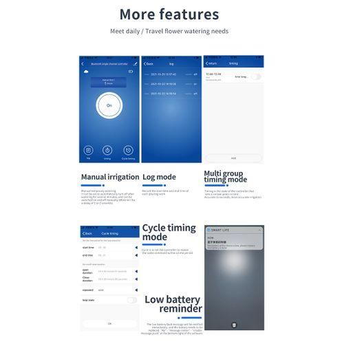 The following is the detailed introduction about our products: 1. Remote Control and Smart Watering: Water hose timer design with Bluetooth 5.0, easy and convenient scheduling through the app within a range of 49.2ft(without interfere); Smart hose timer allow you watering on minutes, hours, specific days of the week.