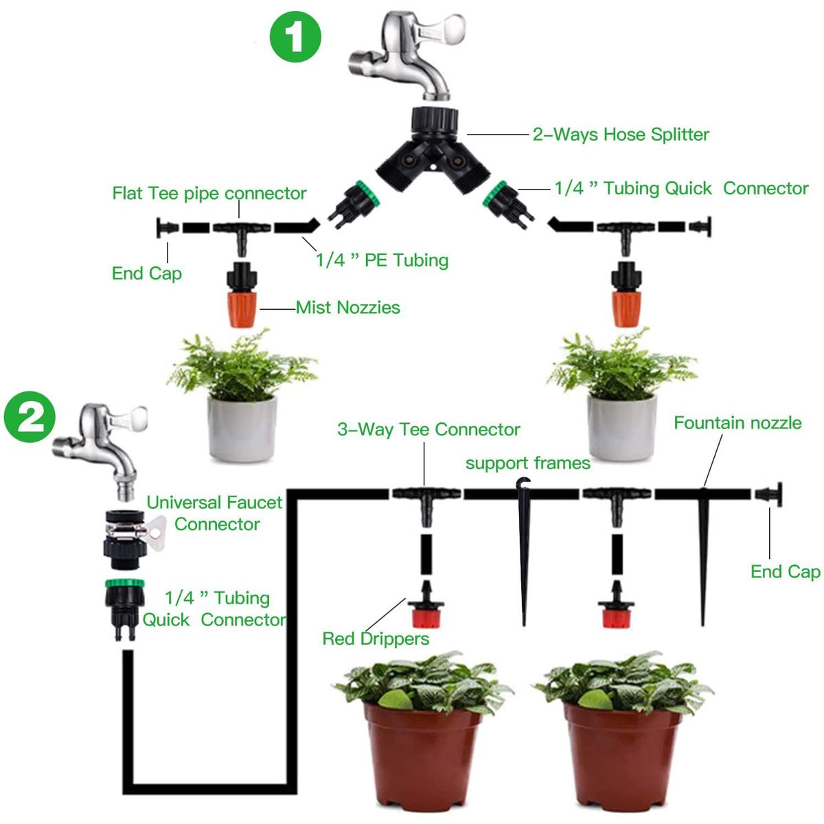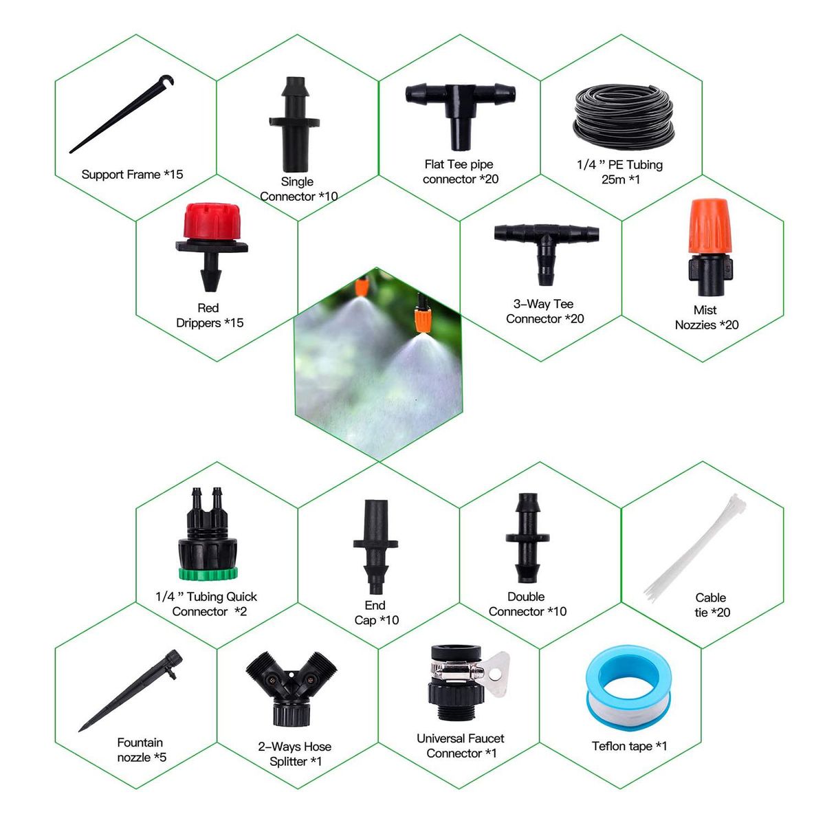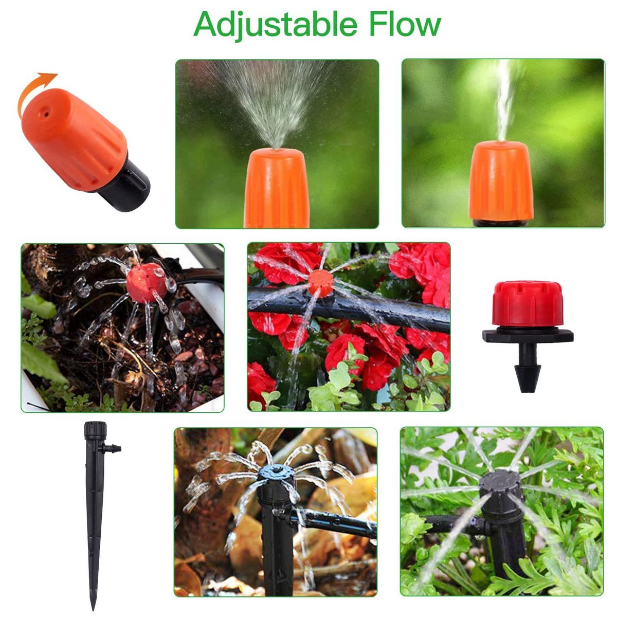 Wide applications: the irrigation system kit is Perfect for spraying, lawn watering, patios, gardens, vegetable watering, roof cooling, irrigation, agriculture, vegetables, greenhouses, flower beds, fog cooling, irrigation of swimming pools, etc