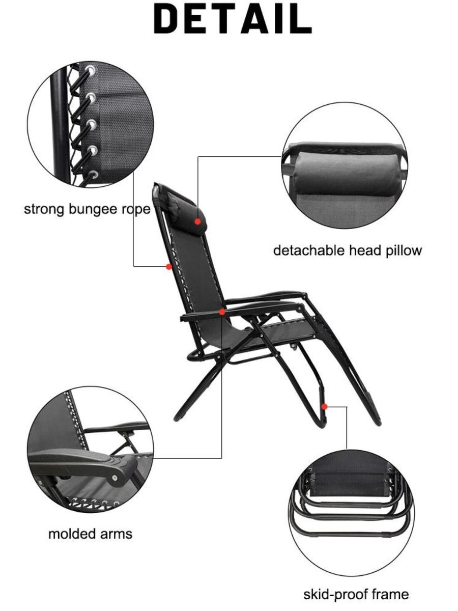 Product OverviewsAdjustable Reclining Position: Locks under each armrest to keep the zero gravity lounge chair in a suitable position. The lounge chair can be adjusted for maximum comfort. It will help you relieve the stress on your backSturdy Frame and Durable Fabric: The anti gravity chair's sturdy steel frame will support weight up to 300 pounds. The reclining camping chair is made from high quality and durable mesh fabric for a relaxing experience, the fabric is waterproofPerfect Size: When setting up, outdoor recliner measures 177(L) x 68(W) x 113cm, Easy to carry and store; Folding structure makes folding the chair simple. The patio recliner size will meet the daily useRemovable & Adjustable Headrest: Unlike other outside lounge chairs, this folding lounge chair has a removable headrest for comfort that can also be used as a back support pillow. It also has a footrest for a more comfortable experienceVersatile: Use the zero gravity chair as a recliner at home, while camping or as a folding bed/lounger; Great for camping trips, your patio or as additional seating in your living room. The reclining lawn chair is suitable for outdoor and indoor use