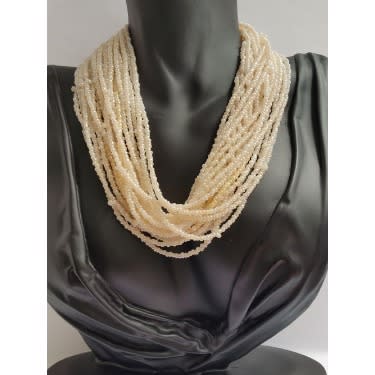 This handmade white multicoloured glass bead necklace is 91cm long. It is made up of 12 strands, each finished with a pewter screw clasp. It can be worn as a simple long multi-strand necklace, doubled up for a fuller fit, or layered. With this necklace, there are endless possibilities.