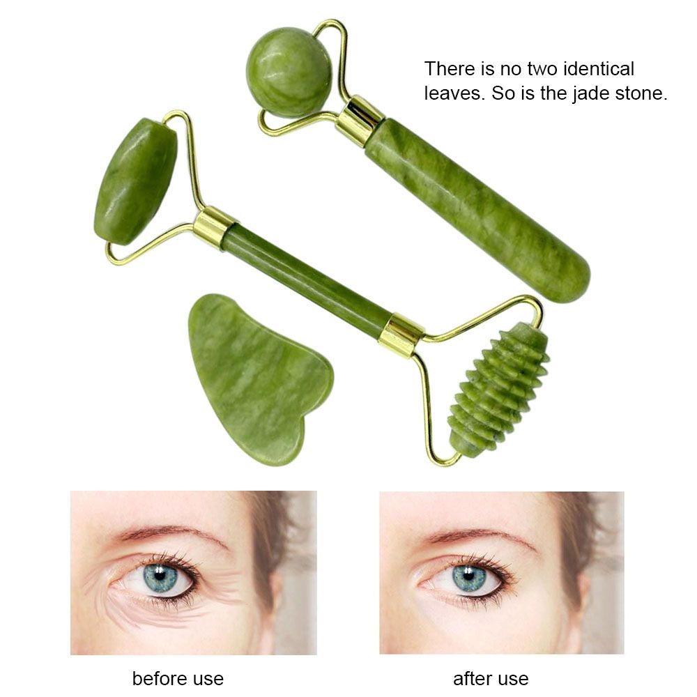 A jade roller, a double-ended jade roller and a Gua Sha scraper are included.