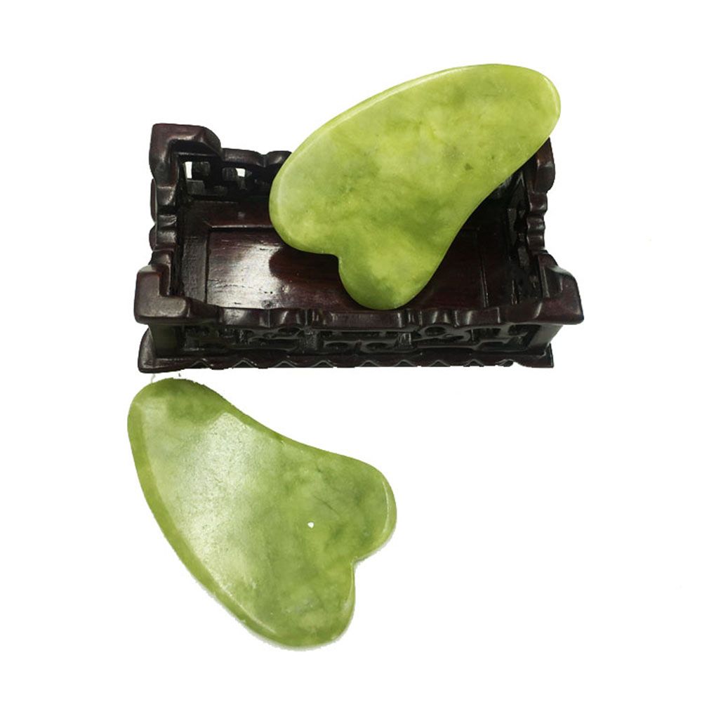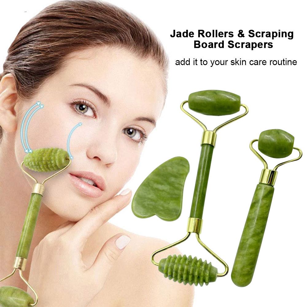A jade roller, a double-ended jade roller and a face scraper are included.