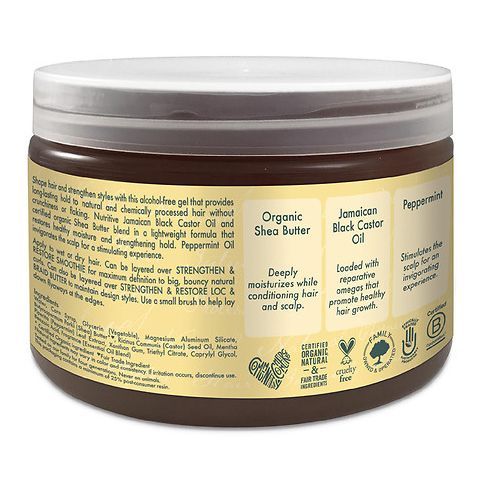 Shape hair and strengthen styles with this alcohol-free gel that provides long-lasting hold to natural and chemically processed hair without crunchiness or flaking. Nutritive Jamaican Black Castor Oil and certified organic Shea Butter blend in a lightweight formula that restores healthy moisture and strengthening hold. Peppermint oil invigorates the scalp for a stimulating experience.