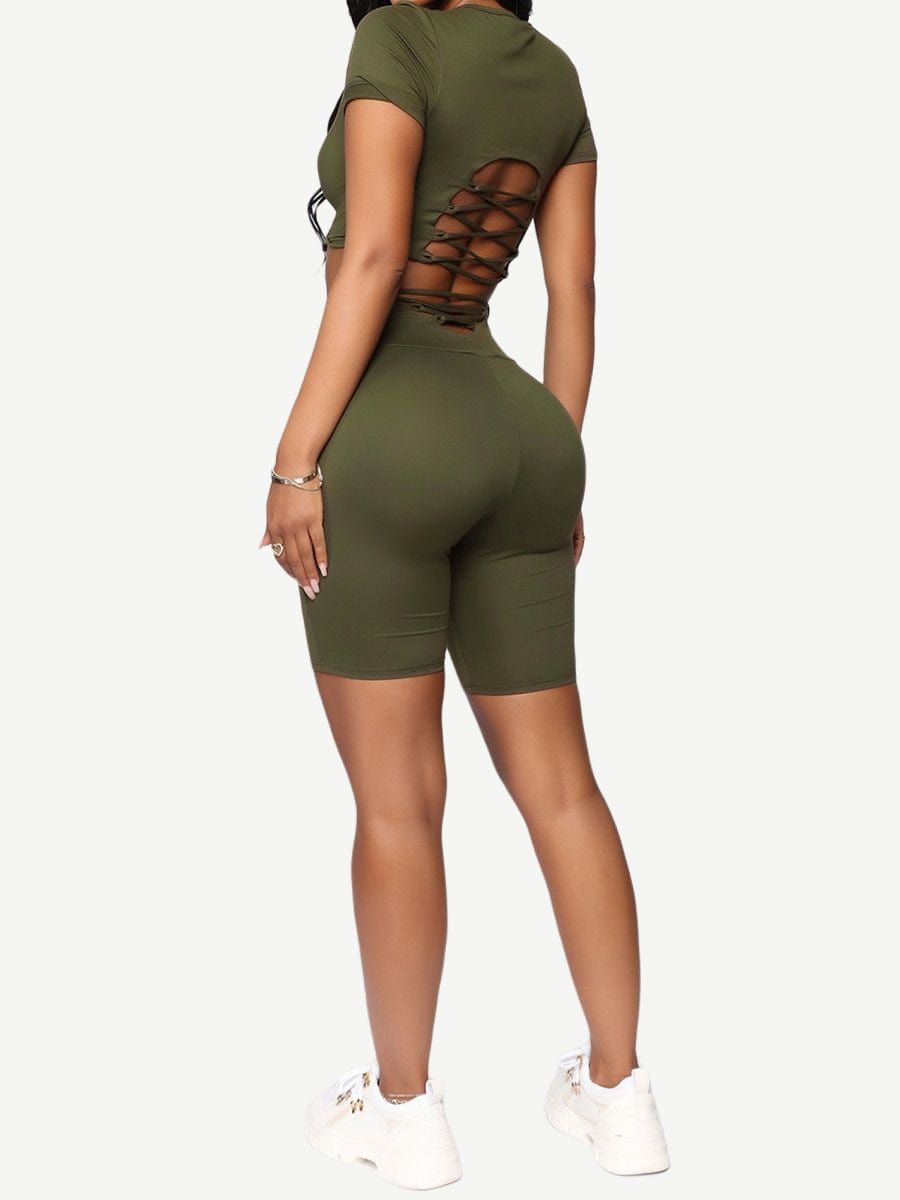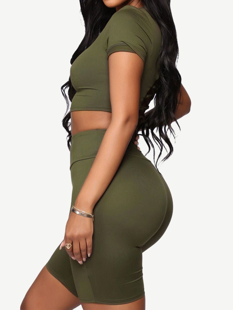 The Jemie active wear/ sportwear is a 2 in 1 sportwear set, has both shorts and a matching top of same material.The top is short sleeved with a round neck or u- neck design