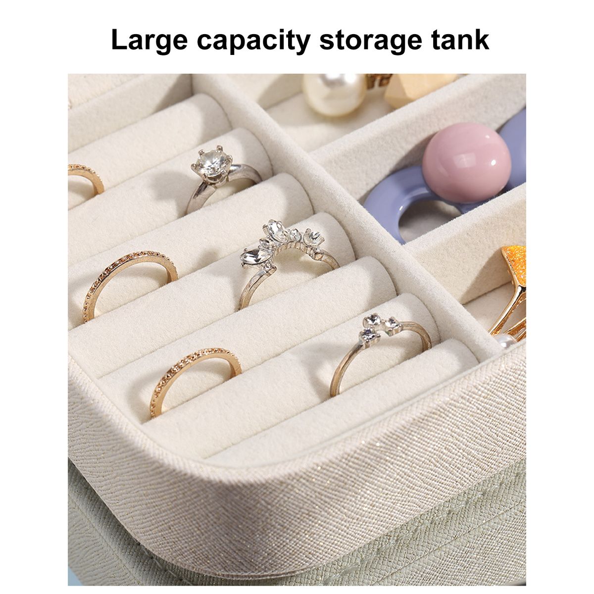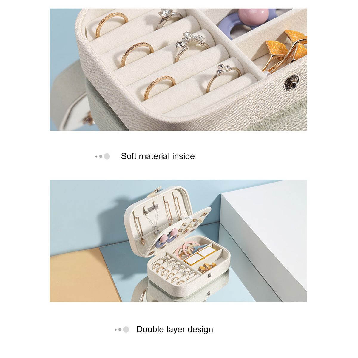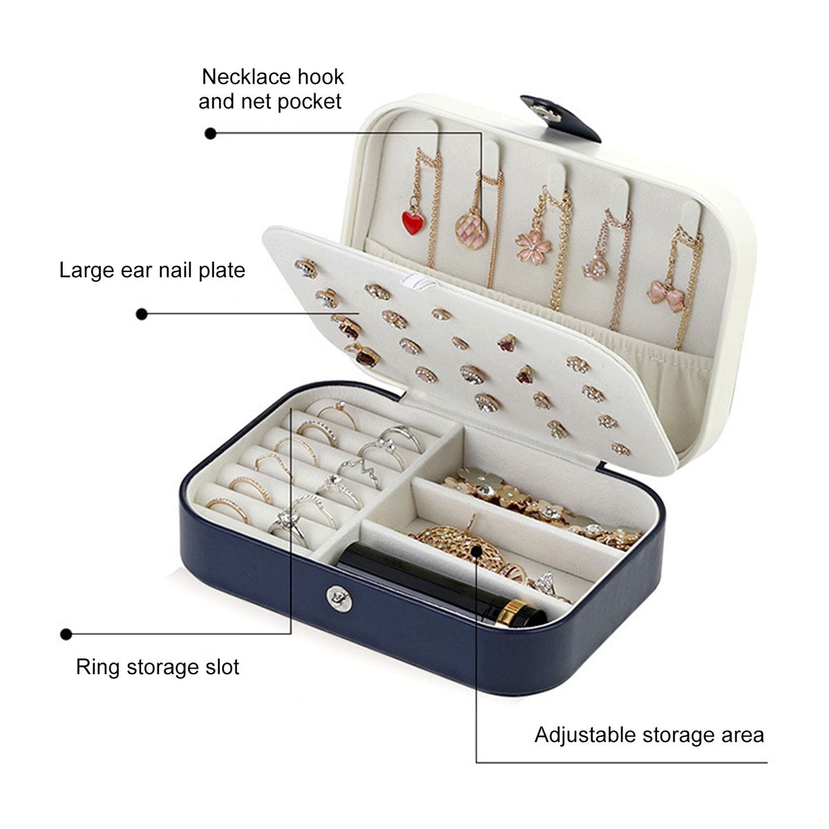 Two-layer design storage case has large capacity for storing necklaces, rings, earring, ear studs, bracelets, watch and more.
