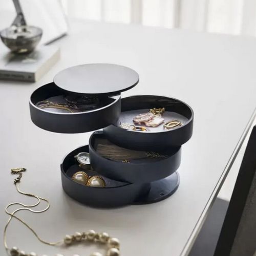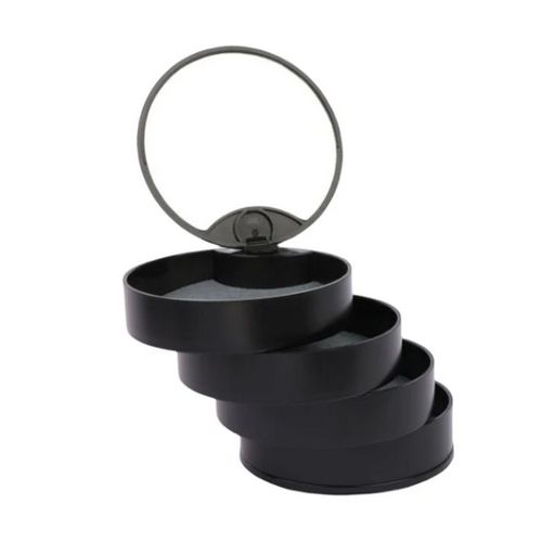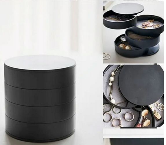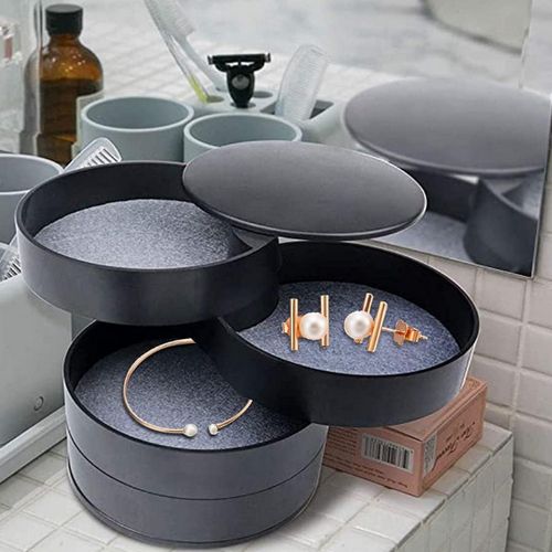 Environmentally friendly material: Made of ABS plastic, which is non-toxic, odorless, environmentally friendly and durable. Each layer has a soft non-woven fabric to prevent scratches and damage to jewelry. Offers you a safe and convenient storage space.360 Degree Rotatable DesignThe 360-degree rotatable design provides easy access to find your favorite treasure in seconds.4-Layer Storage Space Enough space for storing rings, earrings, necklaces, lipstick, hair accessories, mini makeup brushes and other small accessories to classify your different jewelry and prevent you from confusion of storage jewelry.Say "Goodbye" to "Messy": No matter how messy your jewelry is, insert it, turn the storage box and your room is cleaned immediately and cleaned. You're not worry that you will not find your earrings anymore. It protects your jewelry from dust, fingerprints, scratches, damage and theft.The perfect gift: This elegant jewelry box is a beautiful and thoughtful gift for any elegant lady. A great gift for girlfriend, wife, daughter, colleagues, friends and mom on Birthday, Christmas or New Year.