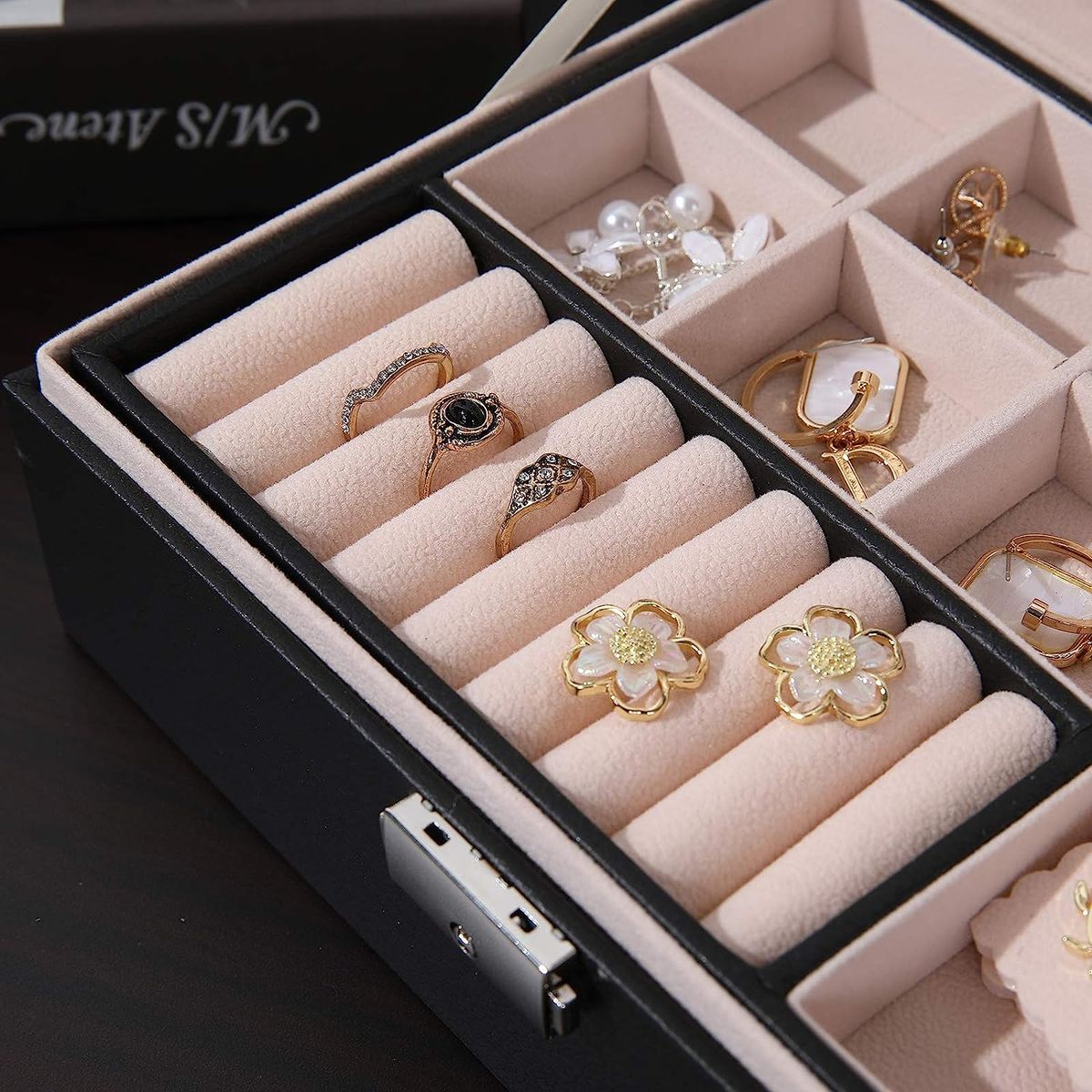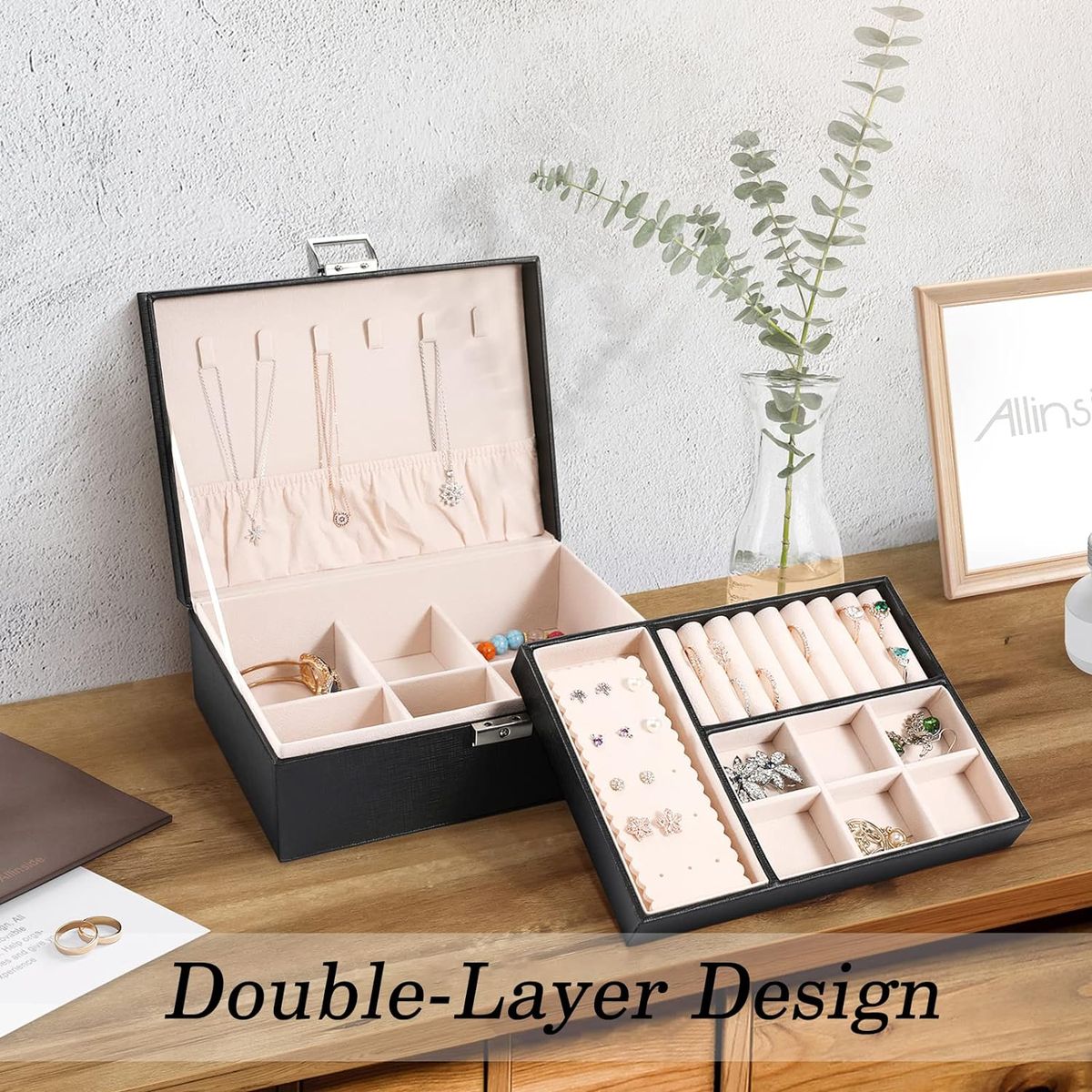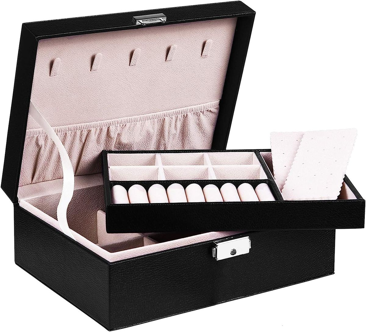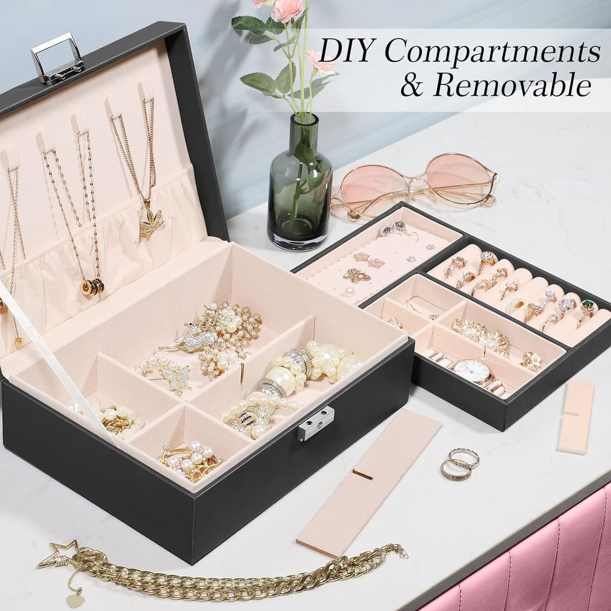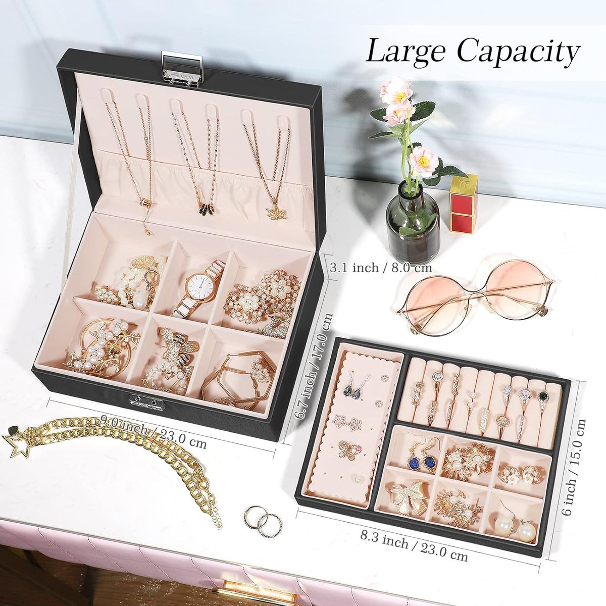 Large Capacity Jewelry Box Organizer】 -- The jewelry box for women can put all kinds of jewelry, including necklaces, bracelets, earrings, studs, brooches, rings, watches and other keepsakes, jewelry storage box organizer let your rings, earrings and other little jewelry well organized and ready to wear, never lose your jewelry ever again. Perfect jewelry box for girls【Double-Layer Travel Jewelry Case】 -- The jewelry organizer box comes with two stackable layer and removable compartments can meet different needs. Necklace and earring organizer box built with 8 necklaces holder hooks, 1 large elastic pocket, 10 ring organizer holders, stud plates and adjustable bracelet watches organizer case to keep your jewelry separated and prevent them from shaking and tangling【Large Leather Jewelry Boxes for Women】 -- The travel jewelry organizer is made of PU leather, durable, odorless and moisture proof. The bead fleece interior can protect your jewelry against scratches and damages. Equipped with simple lock can easy to open or close and provide extra security for your valuables【Multi-functional Jewelry Organizer】 -- The jewelry organizer case displays your jewelry neatly and stylishly, which can better classify jewelry. No more messy, damaged or misplaced. Portable jewelry box can save lots of space to make your dressing table and room look neater, ideal for traveling and daily use【Great Ideal Gift】 -- The large travel jewelry case for women is the best gift for Valentine's Days, birthday, mother's day, Christmas or wedding to your firends, and the ladies will be delighted to receive this exquisite jewelry case. Great for Birthday Gift, Mother's day Gift, Christmas Gift and Wedding Gift for girls, women or give yourself【2 Layer Large Jewelry Box with Lock】 -- Jewelry box organizer can better classify jewelry, no more messy, damaged or misplaced. The jewelry storage case can be placed on your dresser, nightstand, bathroom or vanity to make your room looking more neatly