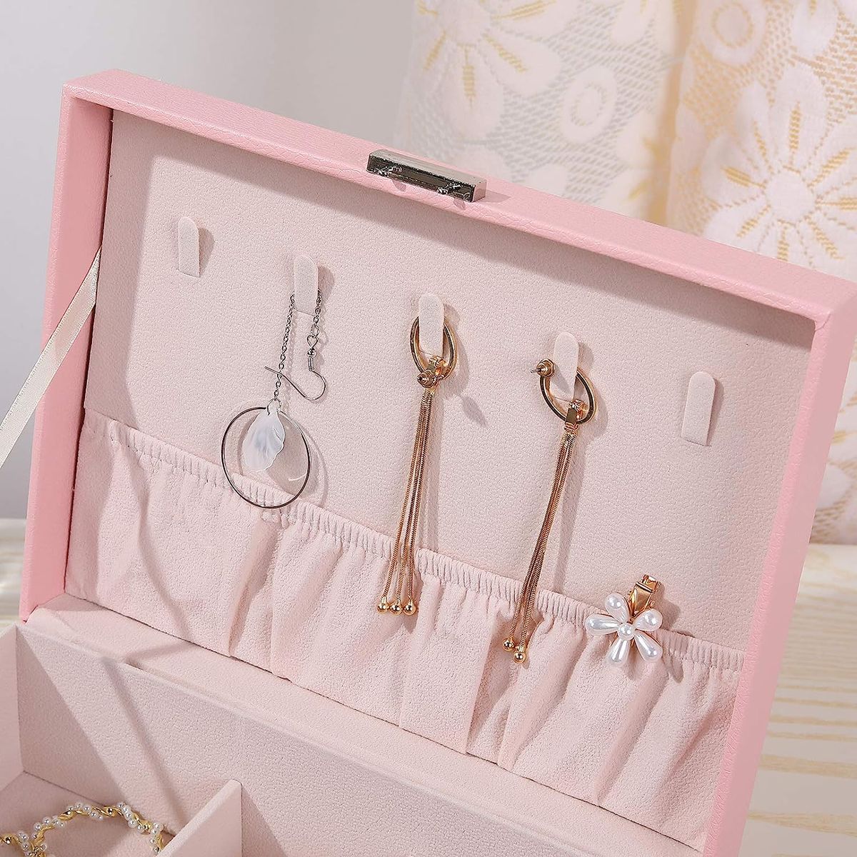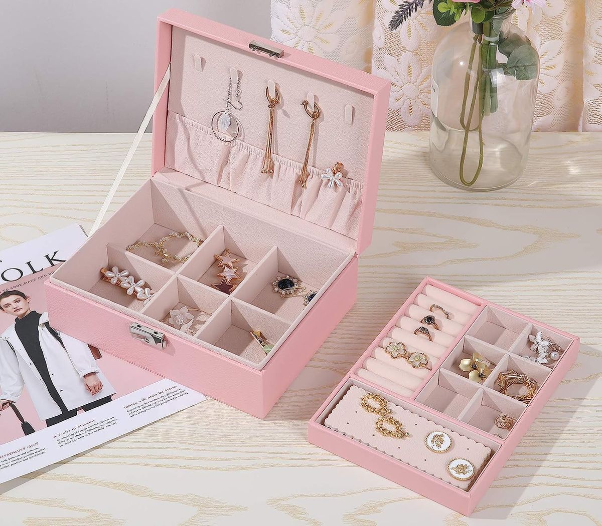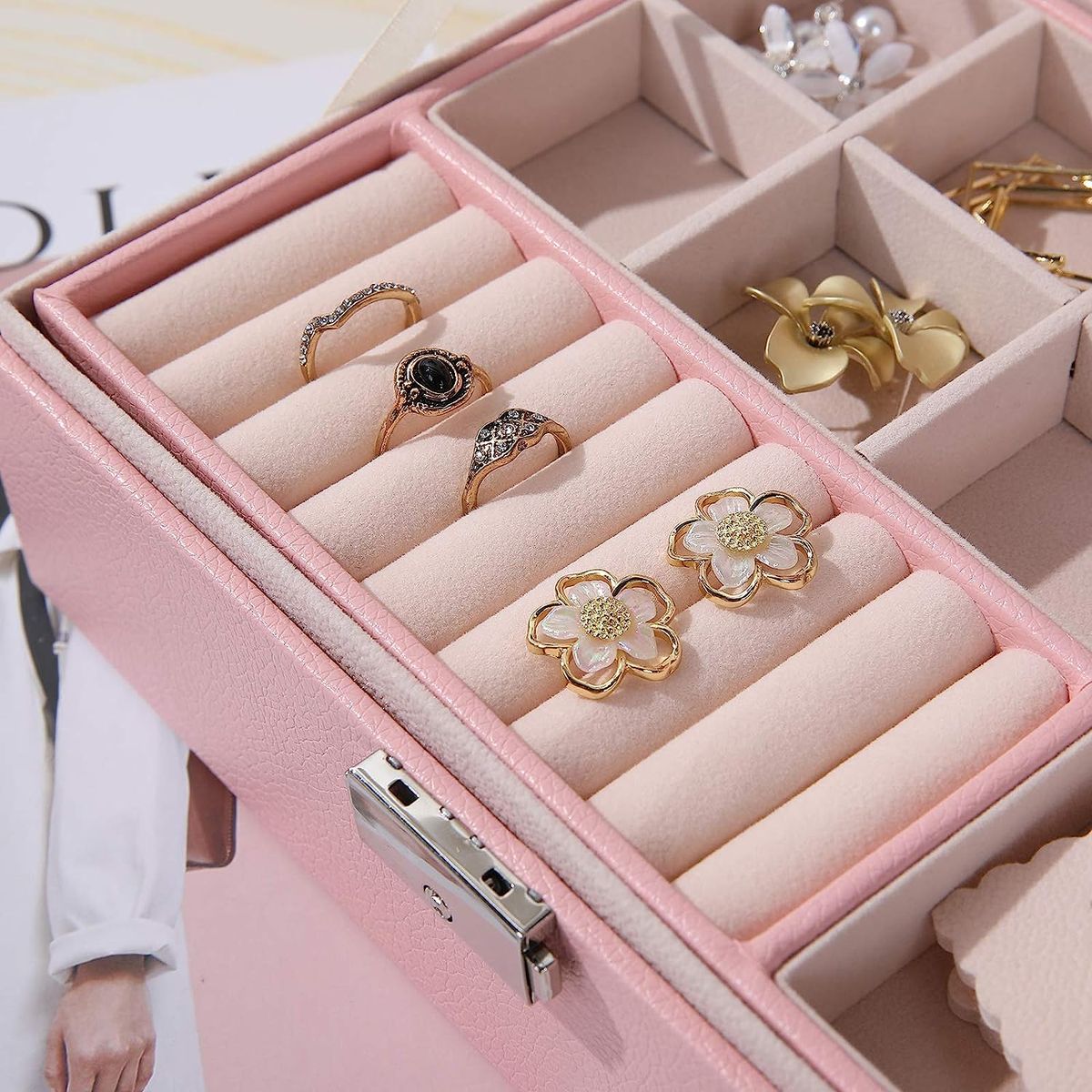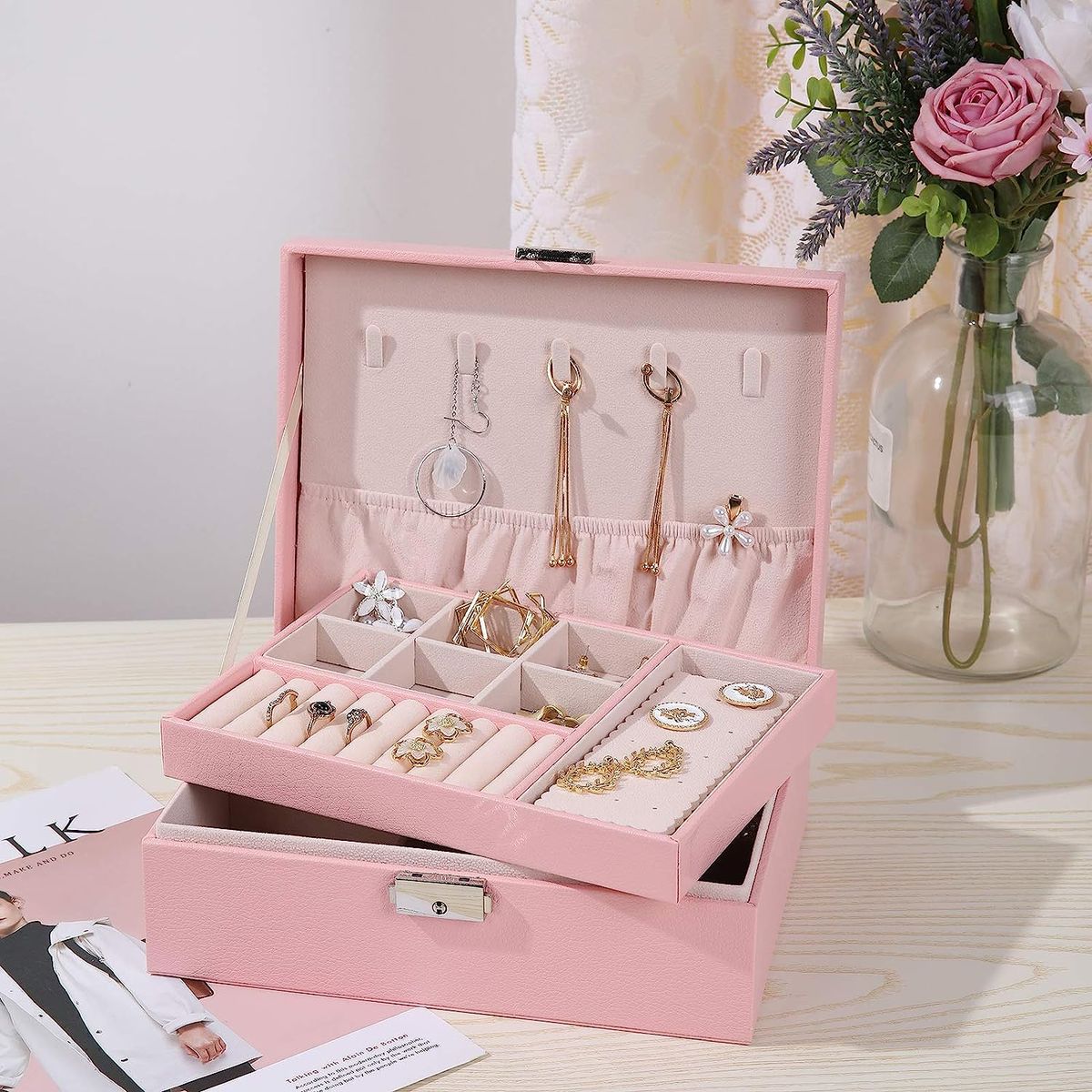 Large Capacity Jewelry Box Organizer】 -- The jewelry box for women can put all kinds of jewelry, including necklaces, bracelets, earrings, studs, brooches, rings, watches and other keepsakes, jewelry storage box organizer let your rings, earrings and other little jewelry well organized and ready to wear, never lose your jewelry ever again. Perfect jewelry box for girls【Double-Layer Travel Jewelry Case】 -- The jewelry organizer box comes with two stackable layer and removable compartments can meet different needs. Necklace and earring organizer box built with 8 necklaces holder hooks, 1 large elastic pocket, 10 ring organizer holders, stud plates and adjustable bracelet watches organizer case to keep your jewelry separated and prevent them from shaking and tangling【Large Leather Jewelry Boxes for Women】 -- The travel jewelry organizer is made of PU leather, durable, odorless and moisture proof. The bead fleece interior can protect your jewelry against scratches and damages. Equipped with simple lock can easy to open or close and provide extra security for your valuables【Multi-functional Jewelry Organizer】 -- The jewelry organizer case displays your jewelry neatly and stylishly, which can better classify jewelry. No more messy, damaged or misplaced. Portable jewelry box can save lots of space to make your dressing table and room look neater, ideal for traveling and daily use【Great Ideal Gift】 -- The large travel jewelry case for women is the best gift for Valentine's Days, birthday, mother's day, Christmas or wedding to your firends, and the ladies will be delighted to receive this exquisite jewelry case. Great for Birthday Gift, Mother's day Gift, Christmas Gift and Wedding Gift for girls, women or give yourself【2 Layer Large Jewelry Box with Lock】 -- Jewelry box organizer can better classify jewelry, no more messy, damaged or misplaced. The jewelry storage case can be placed on your dresser, nightstand, bathroom or vanity to make your room looking more neatly