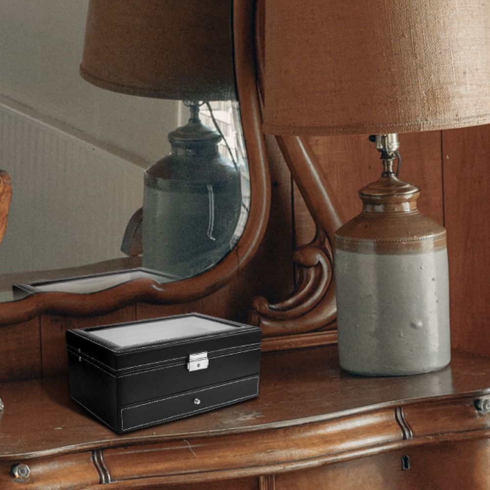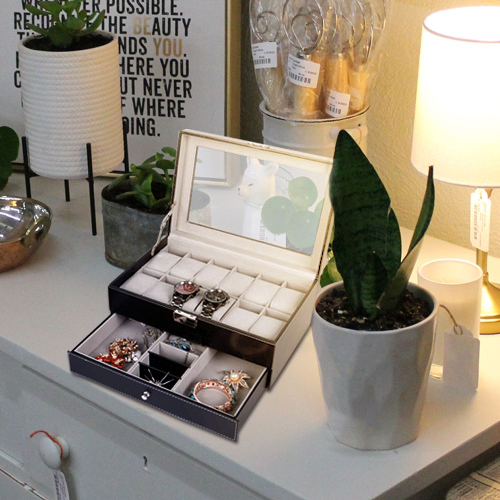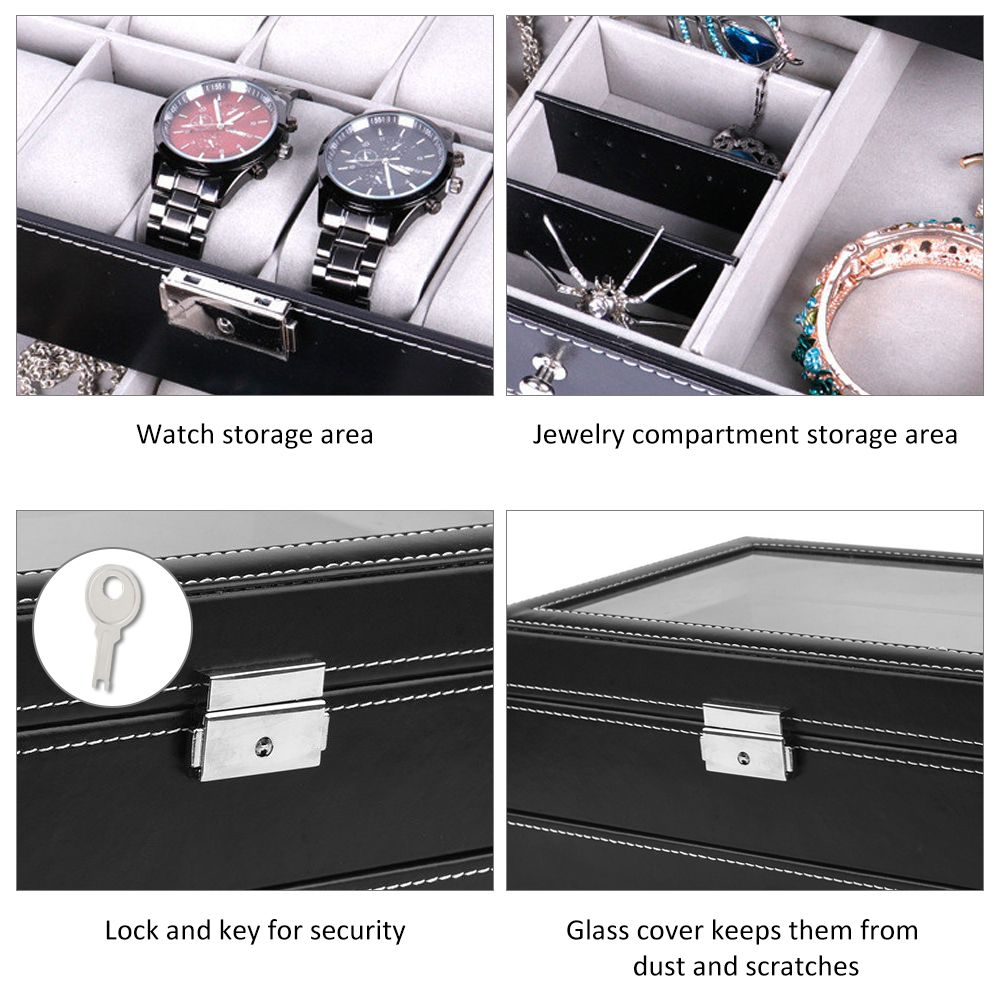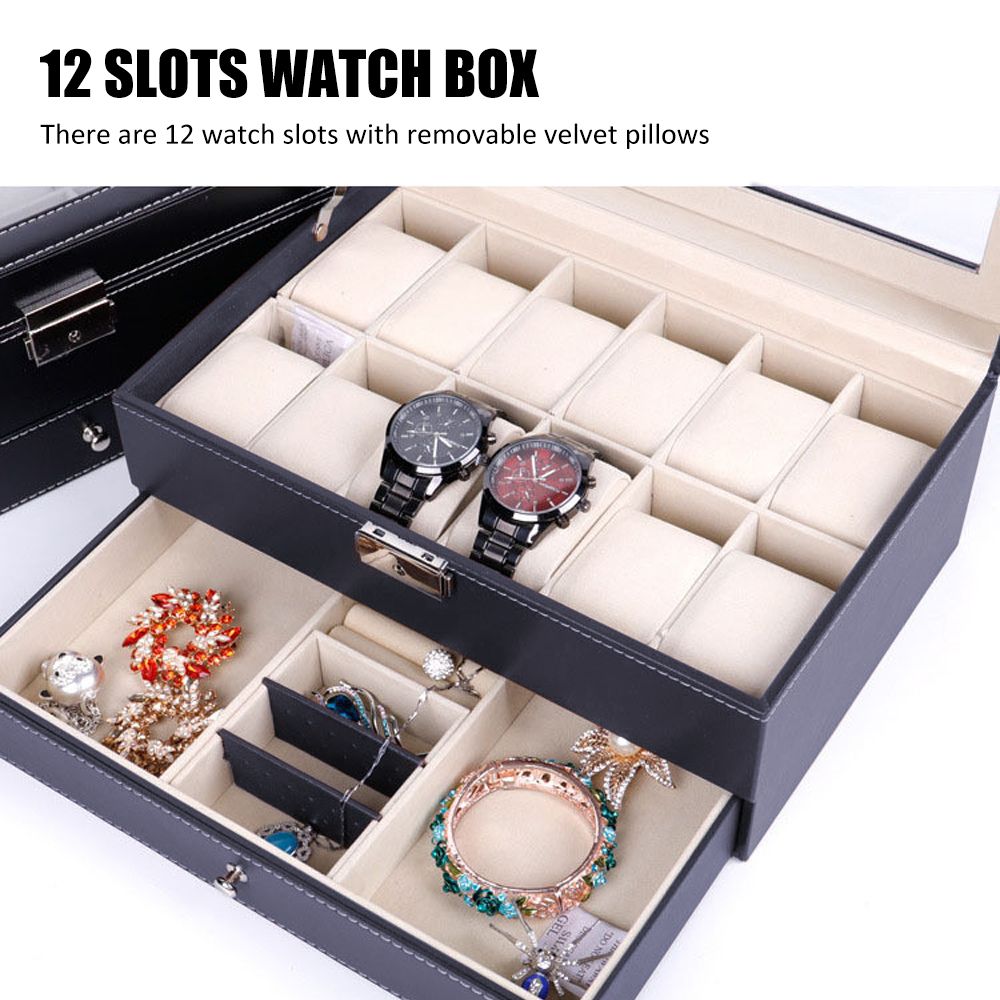 DOUBLE LAYERS: On the top layer of the jewelry box, there are 12 watch slots with removable velvet pillows. And the bottom layer is the storage area for bracelets, necklaces and other accessories.