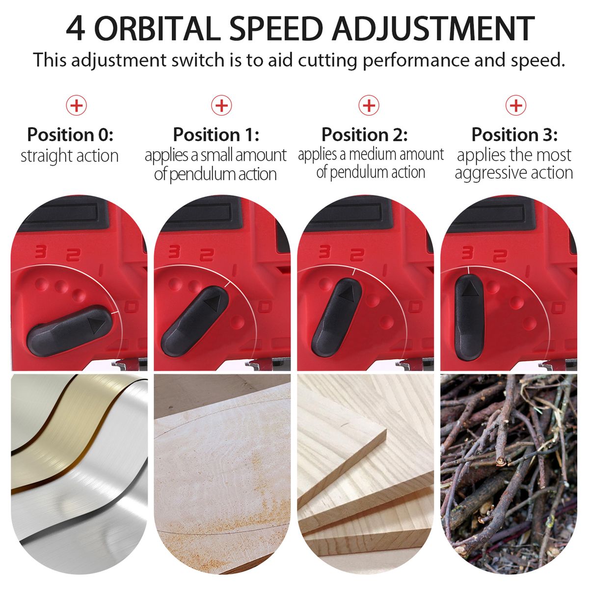 【4 Orbital Position Settings】The curve control technology makes the jig saw\'s orbit can be adjusted in 1 of 4 orbital setting by the designated dial for various cutting tasks and materials. The higher orbital setting can deliver more power for you to cut into wood faster and is perfect for straight cuts. The lower orbital setting is good for curve cuts on wood, PVC and soft metal.