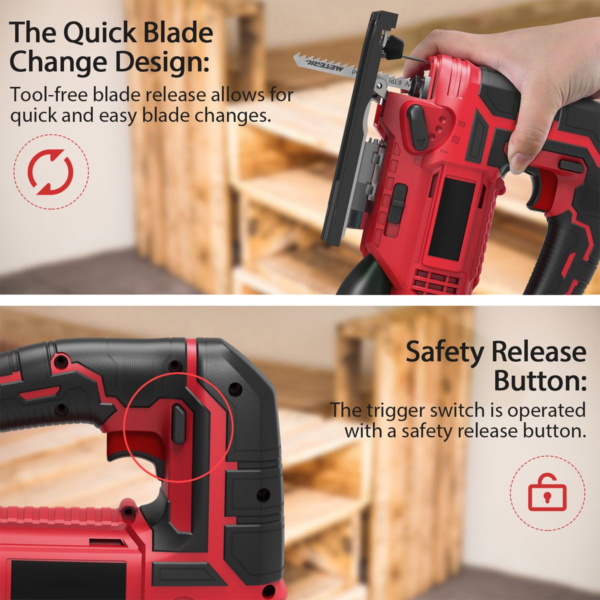 【Bright LED Light amp; Safety Switch】The built-in bright LED light on the jigsaw tool is helpful to work in low light environment by illuminating work surfaces. Safety switch is designed to prevent accidental starting for your safety.