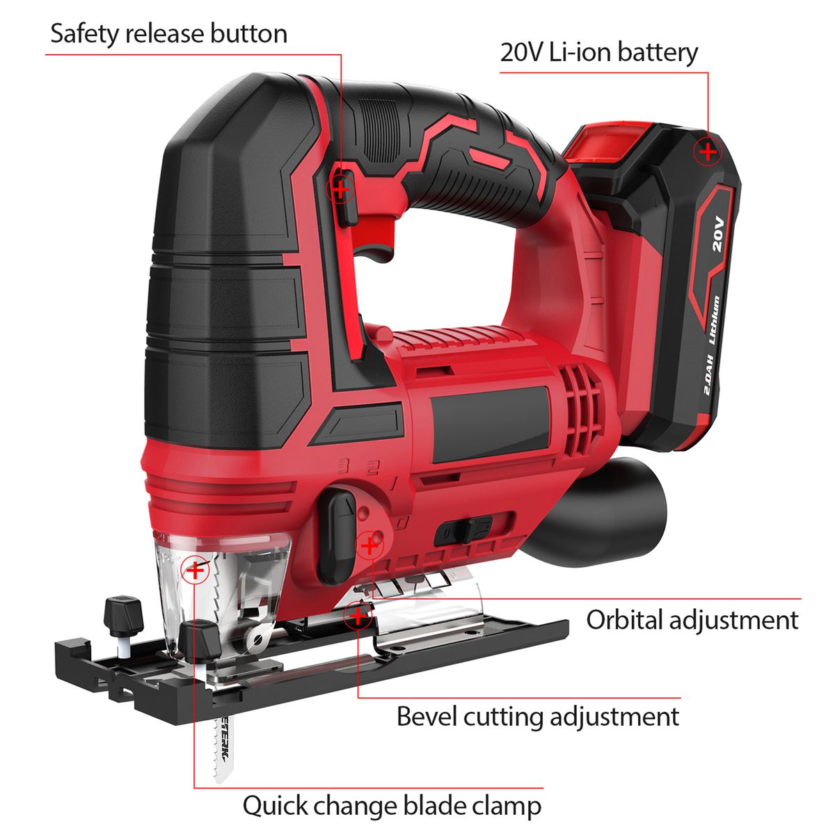 【45 deg; Bevel Adjustment amp; Tool-Free Blade Clamp】The footplate can be adjusted up to 45 deg; to both left and right sides for a wide variety of cuts, such as cutting on uneven surfaces. Tool-Free Blade Clamp allows you to replace T-shank jigsaw blades faster and easier for your convenience.