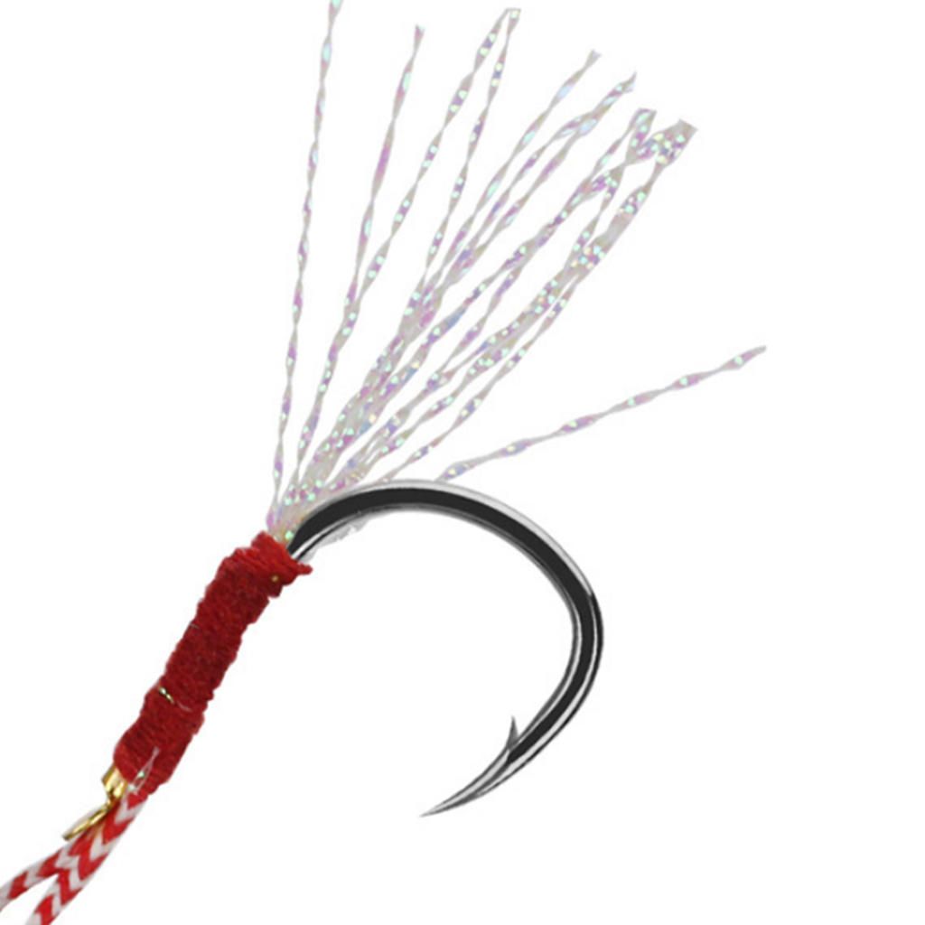Hook end is connected with a flexible strong braided line, easy to attach it to any jig.