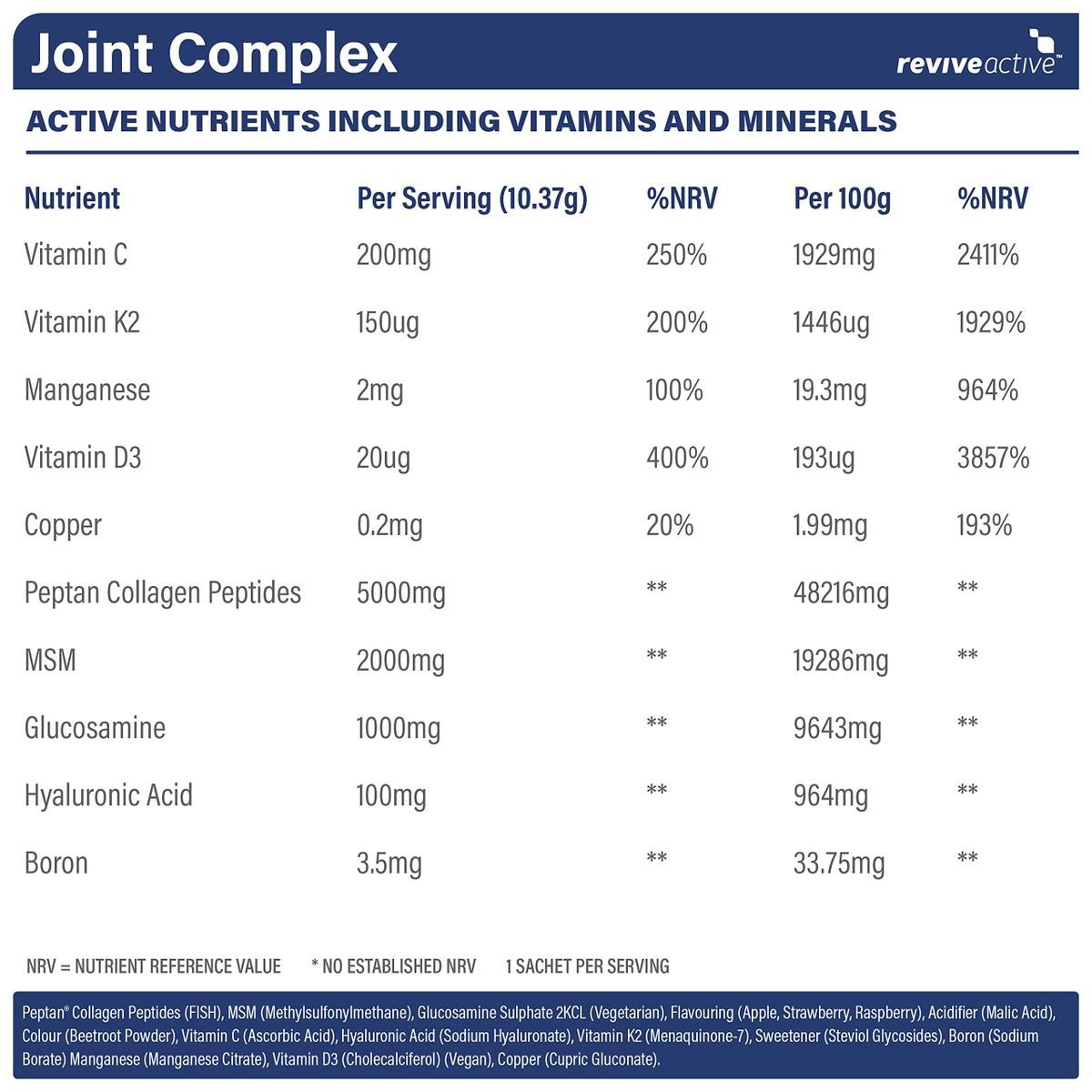 Made in a unique forest fruit flavour using a natural sweetener, steviol glycosides, with ingredients including Collagen Peptides (marine source), Hyaluronic Acid, Glucosamine, and MSM.