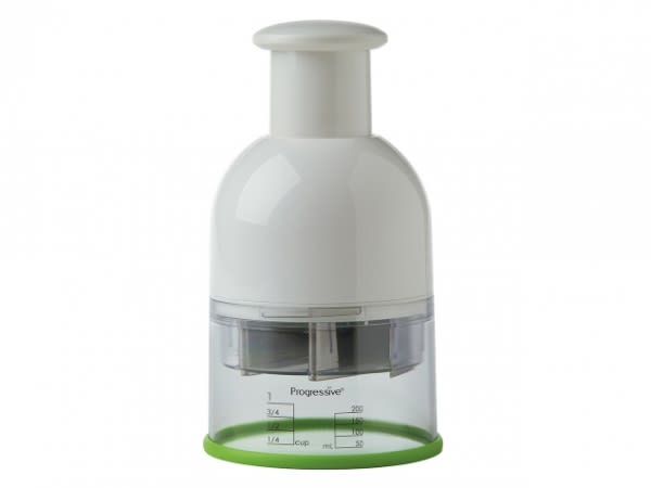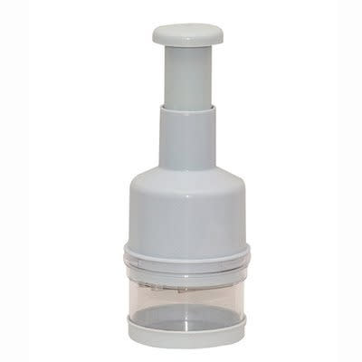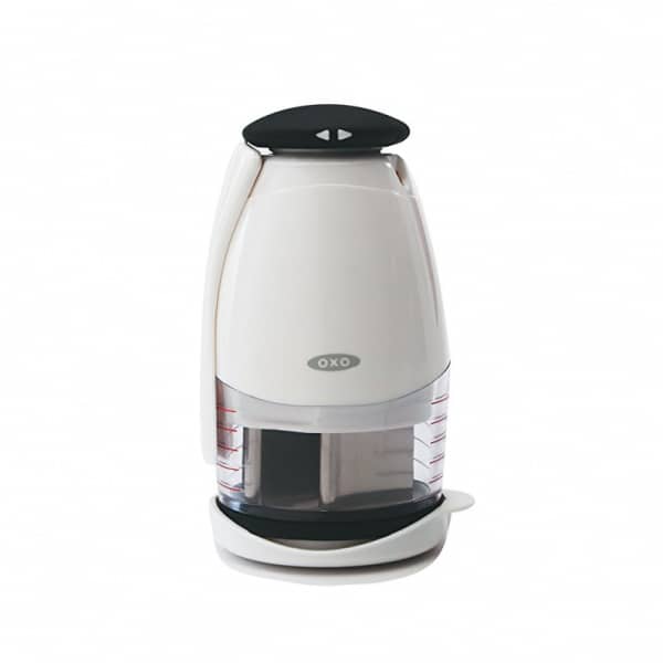 Make easy work of chopping onions, nuts and more with the OXO Good Grips Chopper, just press the soft knob and the blades rotate for even chopping. An internal soft bumper absorbs shock to increase comfort and reduce sound. Chop ingredients in the enclosed cup with its soft, non-slip base, or remove the base and chop directly on a cutting board. A tab rotates within the cup to prevent food from accumulating on the side walls. The entire blade cartridge can be removed from the shopper by simply unscrewing it, so clean up is a breeze. The blade is symmetrical for ease of reassembly. Spoon included for scooping ingredients.