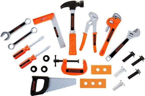 Your little builder will have hours of fun with this Black And Decker Junior Back Pack Tool Set. 23 piece tool set includes: Hammer, Saw, Flat and Phillips head Screwdrivers, pliers, wrench, saw, and many other pieces and tools. Featuring a carrying case for storage of all your tools. For ages 3 and up.