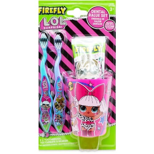Firefly LOL Surprise dental set, featuring two toothbrushes, toothpaste and a beaker & ndash; to make brushing teeth fun for little one's