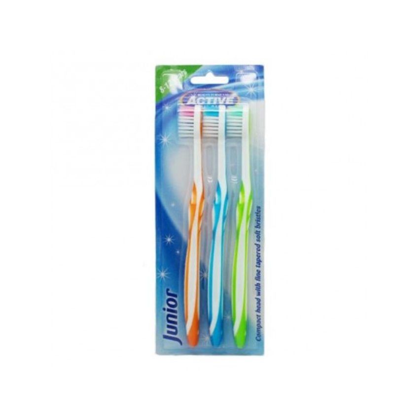 Active Oral Care Junior ToothBrush Triple pack includes 3 colour toothbrushes that are designed to have a compact head, with fine tapered bristles that make it easier for juniors to use.