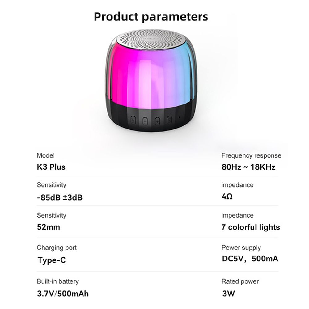 Specification:Brand Name:TninkplusModel:Thinkplus K3 Plus Communication: BTBT Version: 5.2Sound Type: PortableWaterproof: YesDrive Unit:52mmLighting:Colorful lightsCharging port:Type-CPower supply:DC5V,500mABuilt-in battery:3.7V/500mAhRated Power(W):3WPlayback Function: mp3Built-in Microphone: YesMaterial: Plastic