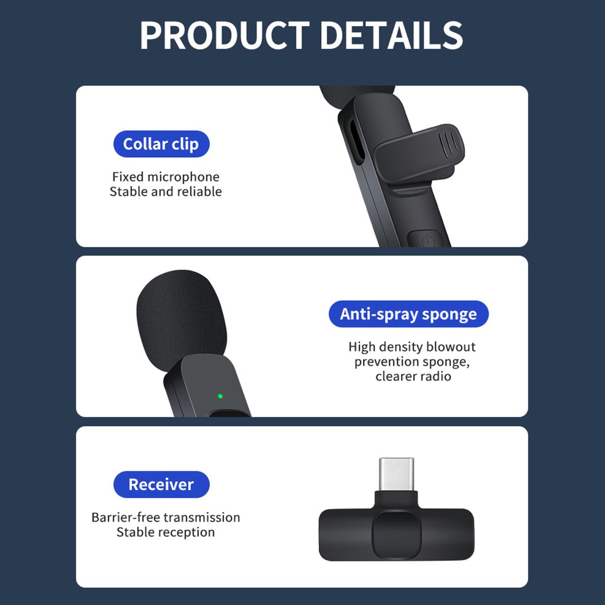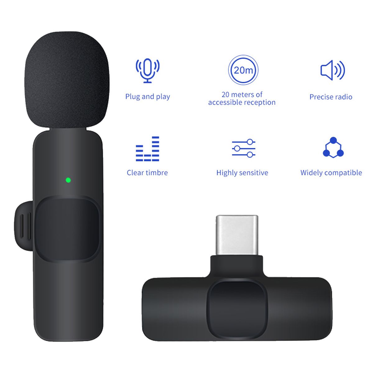 Mini lavalier wireless microphone comes with a Type-C receiver and a transmitter, after pressing the power button it will pair automatically, just Plug and Play. The wireless mini microphone is small and compact, easily clip to Your shirt, tie, or pocket. Support charging while broadcasting.